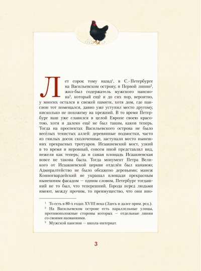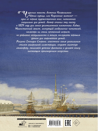 Before you is the famous fairy tale "The Black Hen" by Antoni Pogorelsky. Written in 1829, it was the first author's work for children. But despite such a venerable age, the work has not lost its relevance, and the story of the boy Alyosha, who got into the magical world for his kindness and was expelled from there for pride and arrogance, can serve as a good lesson for modern children. The fairy-tale atmosphere of the story is wonderfully conveyed by Gennady Spirin's illustrations.