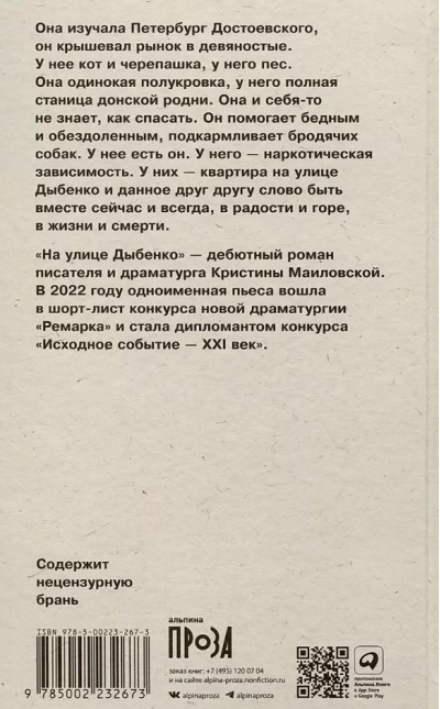 She studied Dostoevsky's St. Petersburg, he was running the market in the nineties. She has a cat and a turtle, he has a dog. She's a lonely half-breed, he has a full flock of Don kin. She doesn't even know how to save herself. He helps the poor and destitute, feeds stray dogs. She has him. He has a drug addiction. They have an apartment on Dybenko Street and a promise given to each other to be together now and always, for better or for worse, in life or death.