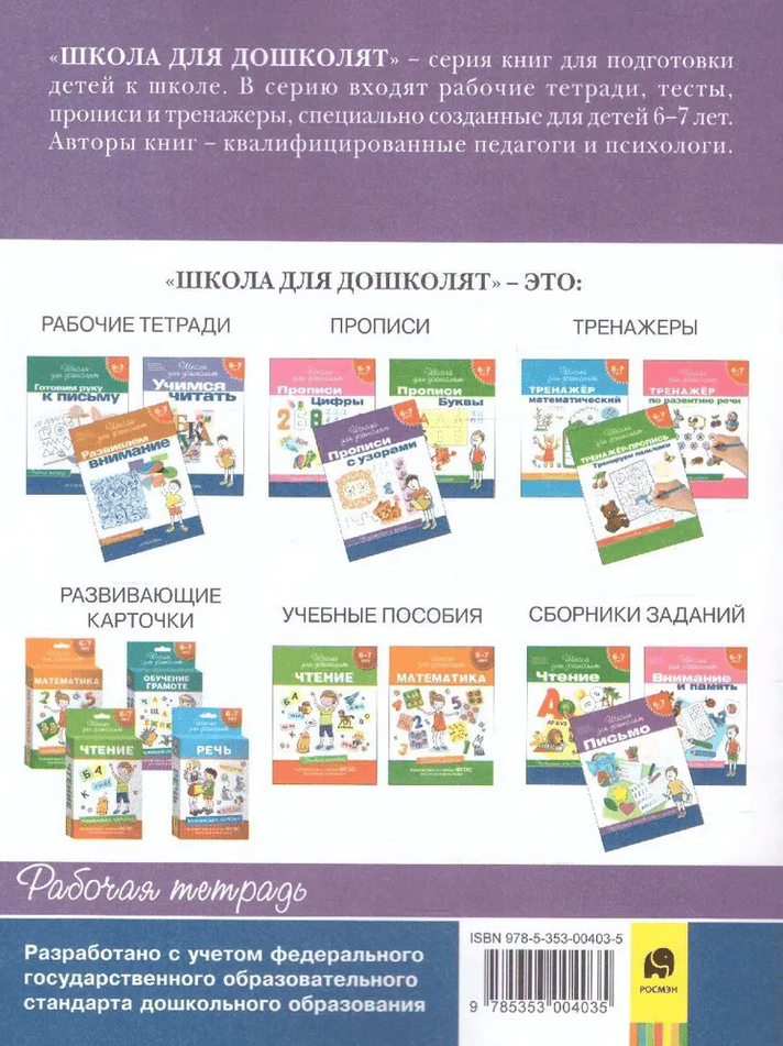 This workbook is designed to develop thinking skills in preschool-aged children. It can be used in group classes in kindergartens and elementary schools, as well as for individual work with children.