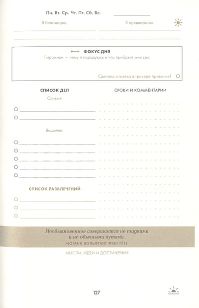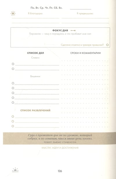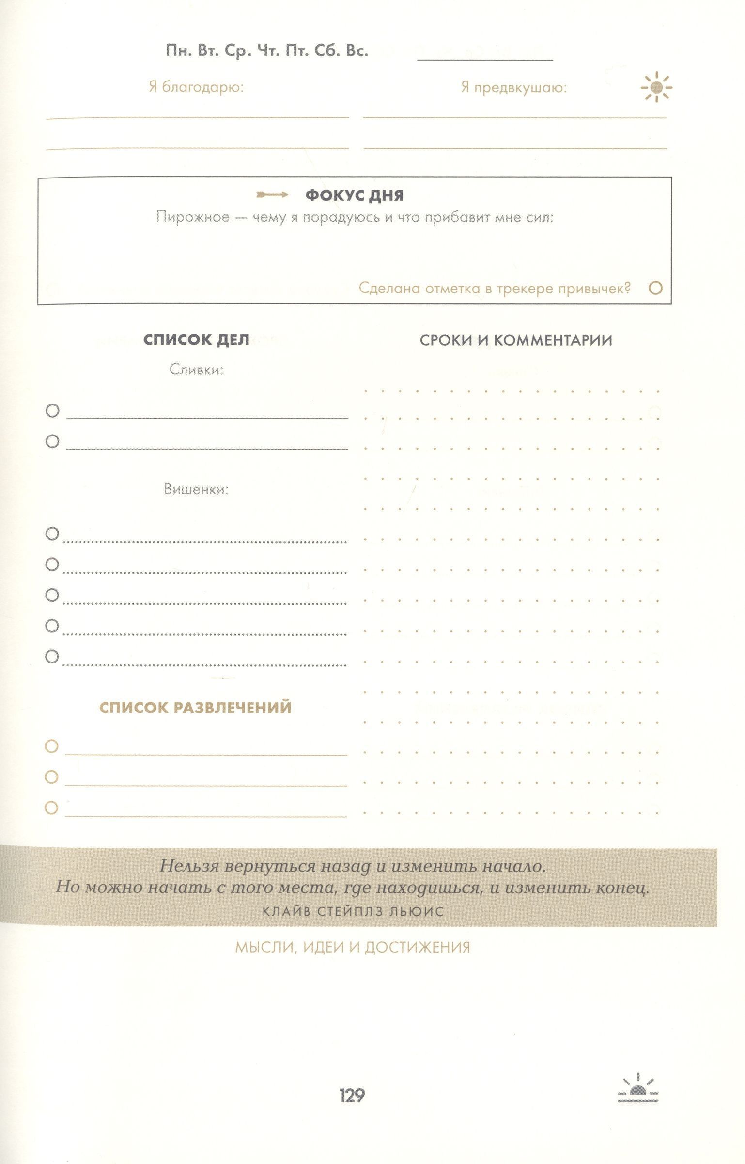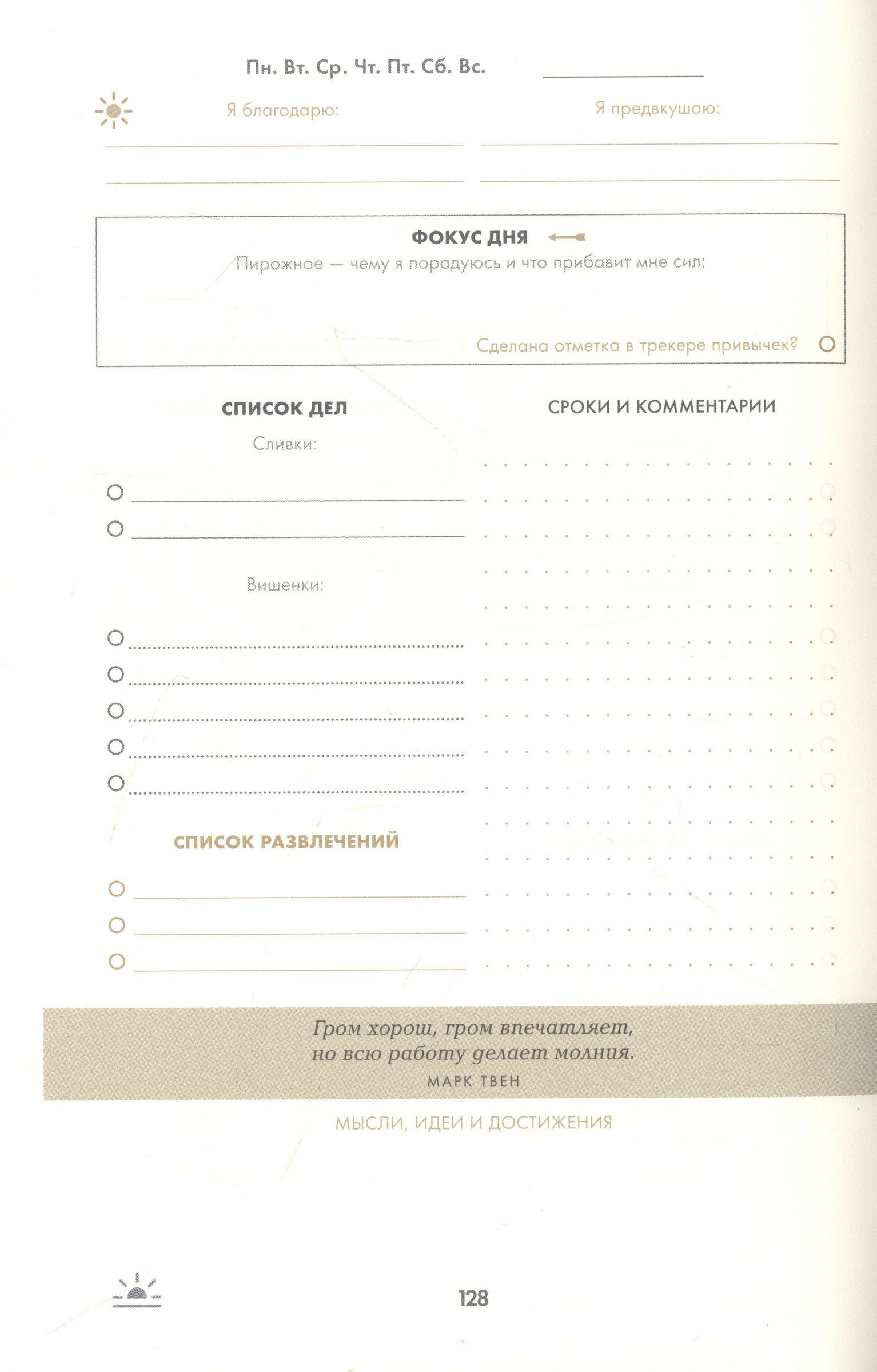 At the heart of the concept of "6 Minutes. Success Diary" is your own definition of success in your professional and personal life. It may be a desire to have more money, fame, love, or perhaps peace of mind, independence. The path to success is as individual as its definition. A diary can help you set goals that meet your personal wants and needs, not other people's expectations. More things to do without fatigue. Through a combination of practical mindfulness exercises and proven productivity strategies, you achieve more goals in a new way: not only consistently, but more calmly.