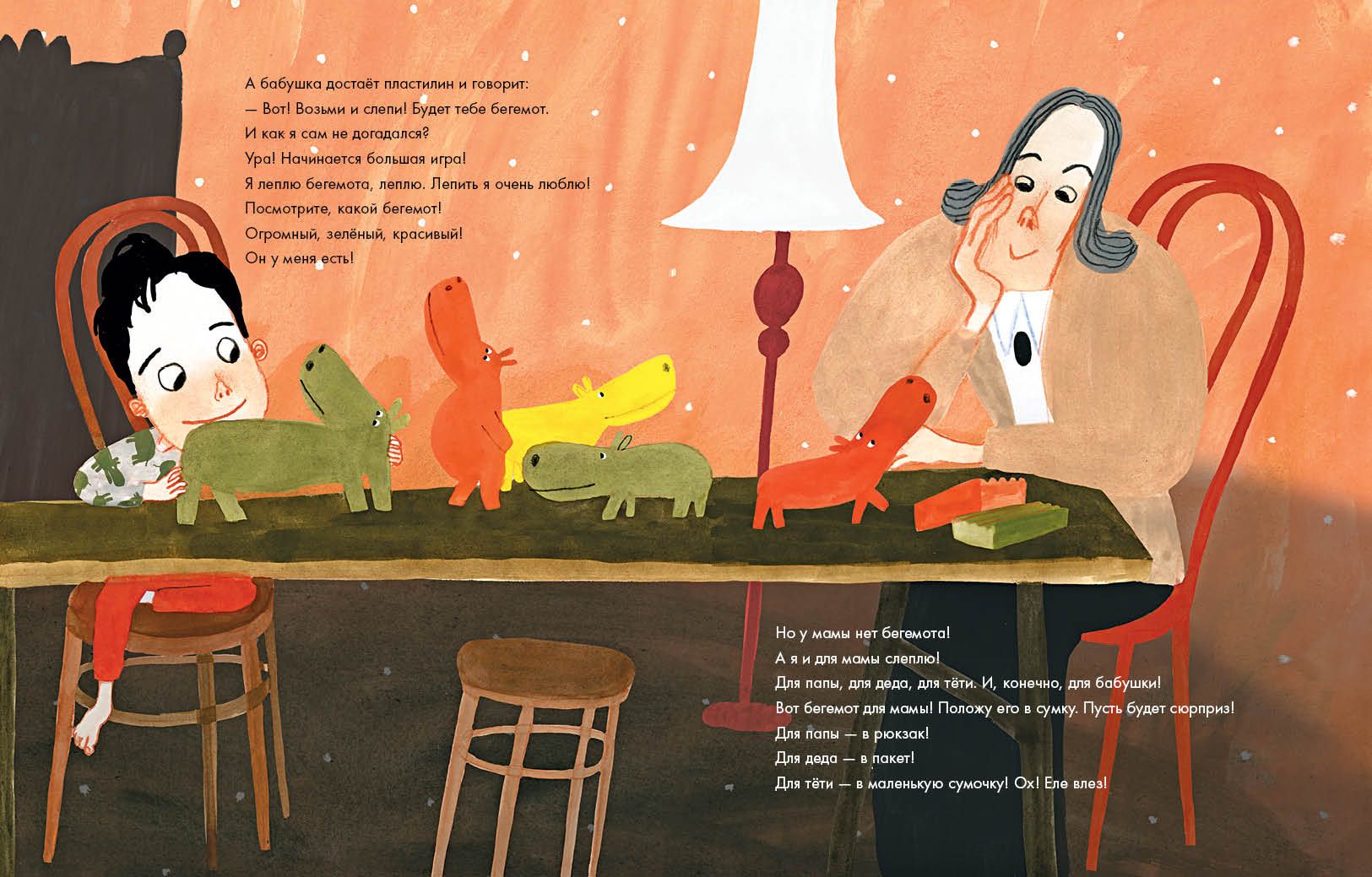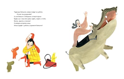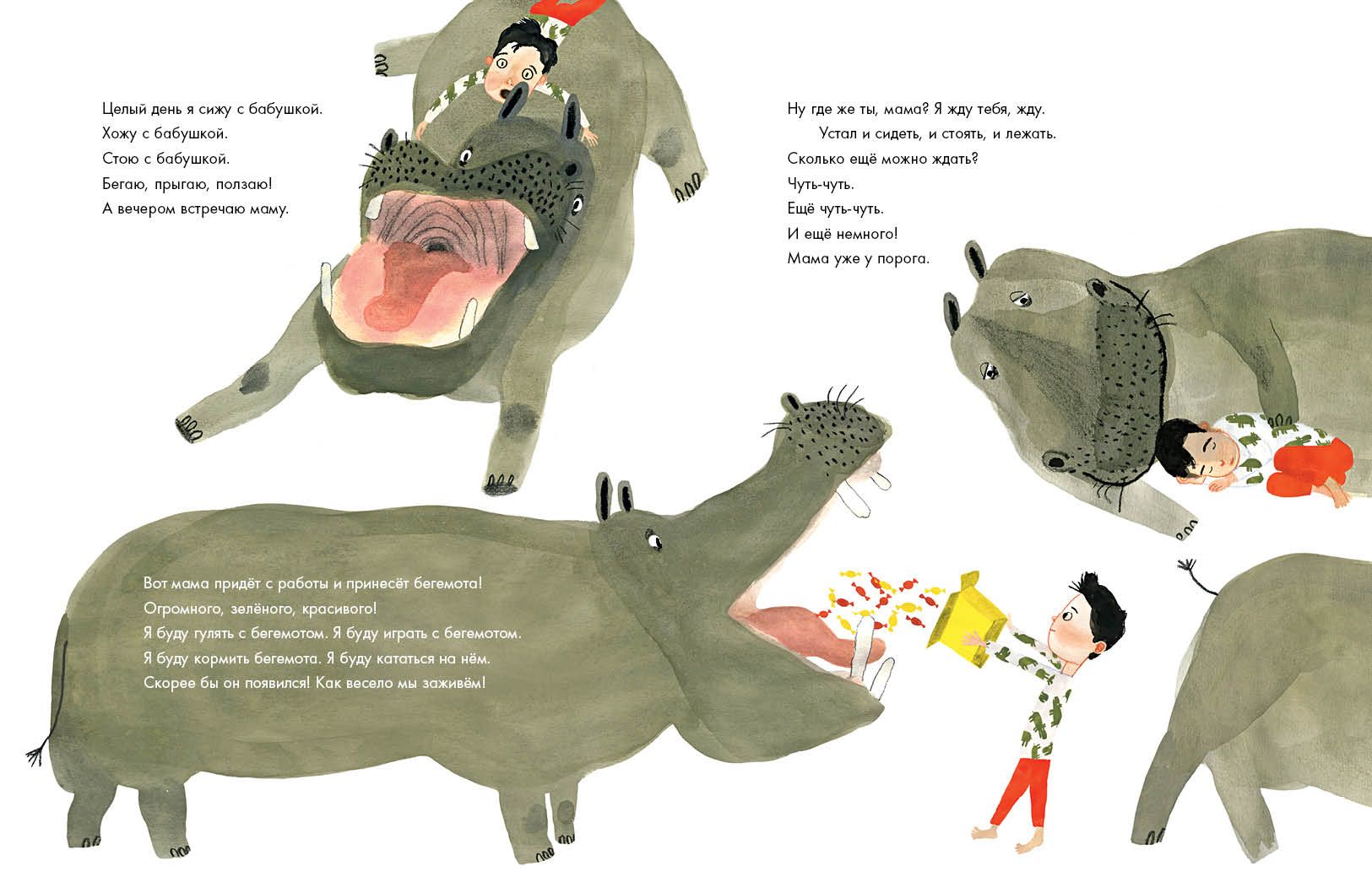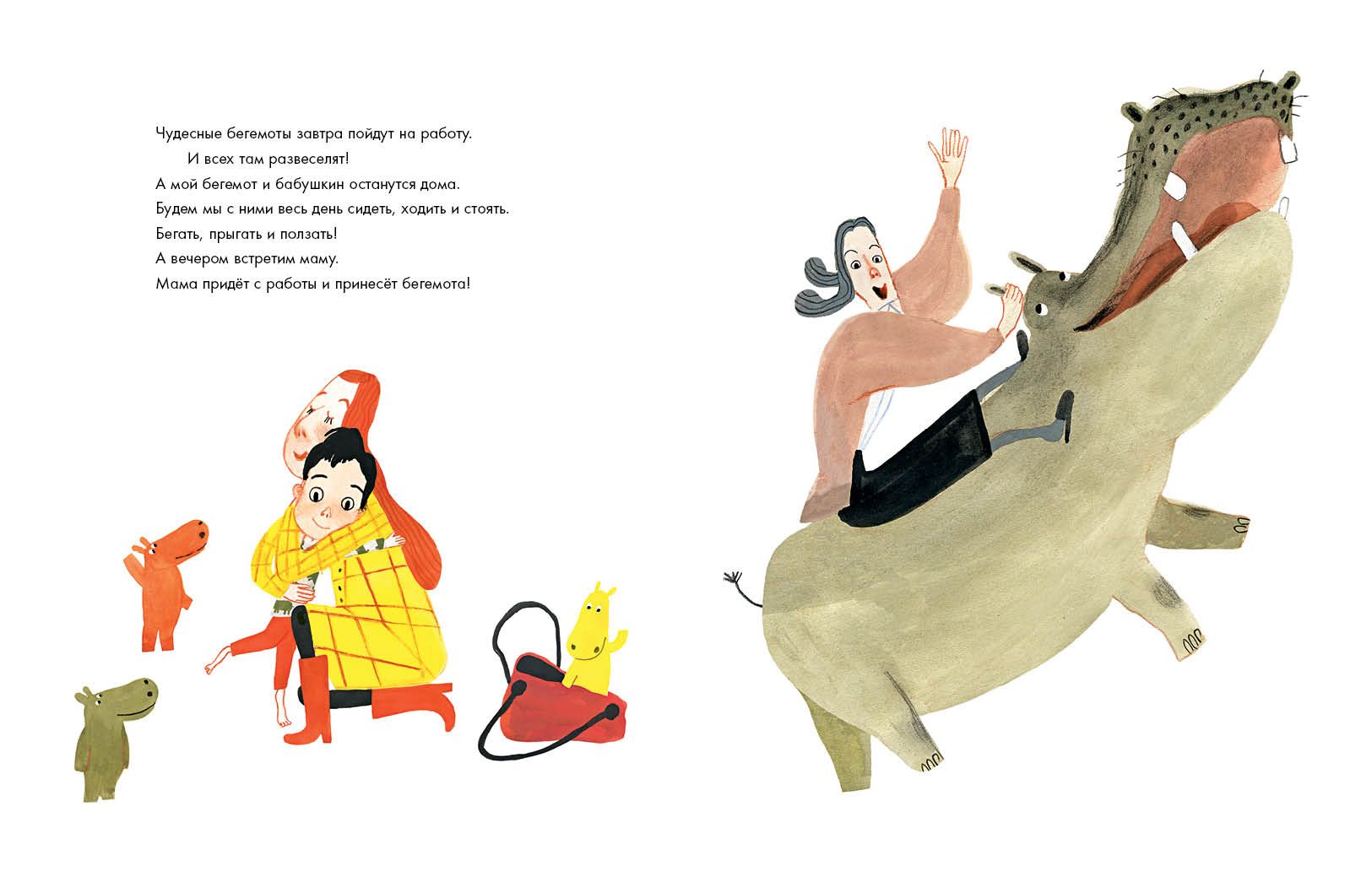 Adults are busy all day long doing their boring adult things. If I had a hippopotamus, a huge, green, beautiful hippopotamus, I would play with it all day long, take it for walks, feed it and ride it. But adults come home from work, and none of them has a hippo: neither mom, nor dad, nor grandpa. What can we do? You can play with this book! Keep your eyes open and you'll find a hippo on almost every page. Can you count them? The game was invented by writer Marina Taranenko and artist Yulia Sidneva