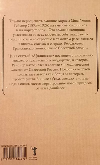 This publication introduces the reader to the selected legacy of Larisa Reisner (1895-1926) — a poet, diplomat, ethnographer, and revolutionary. In the collection of essays "Afghanistan," the author observes the conflict between the "old" and the "new," traditions and innovations in the young eastern state that gained independence with the help of Soviet power. The book also includes essays from different years and the collection "Coal, Iron, and Living People," in which Reisner appears as an implacable fighter for the interests of the working class, a defender of the oppressed.