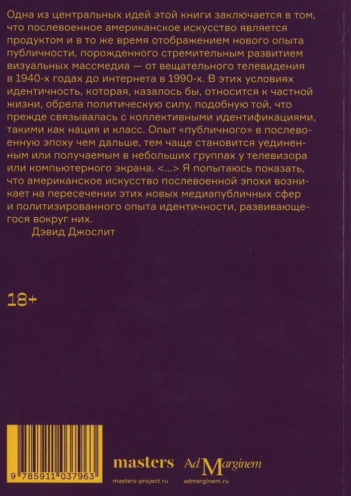 The book by art historian David Joselit is devoted to the art of the USA in the second half of the 20th – early 21st century, when American artists took leading positions in the world and set the main directions of innovative searches in painting (abstract expressionism, pop art), sculpture (minimalism), performance, installation and other media. The author offers a historical overview of this period, selecting and grouping diverse material around one key idea – artists’ rethinking of the experience of privacy and publicity in the new social conditions created by consumer society. The detailed, informative and superbly illustrated text can serve as an introduction to the art of the postmodern era, as well as a reference and educational tool.