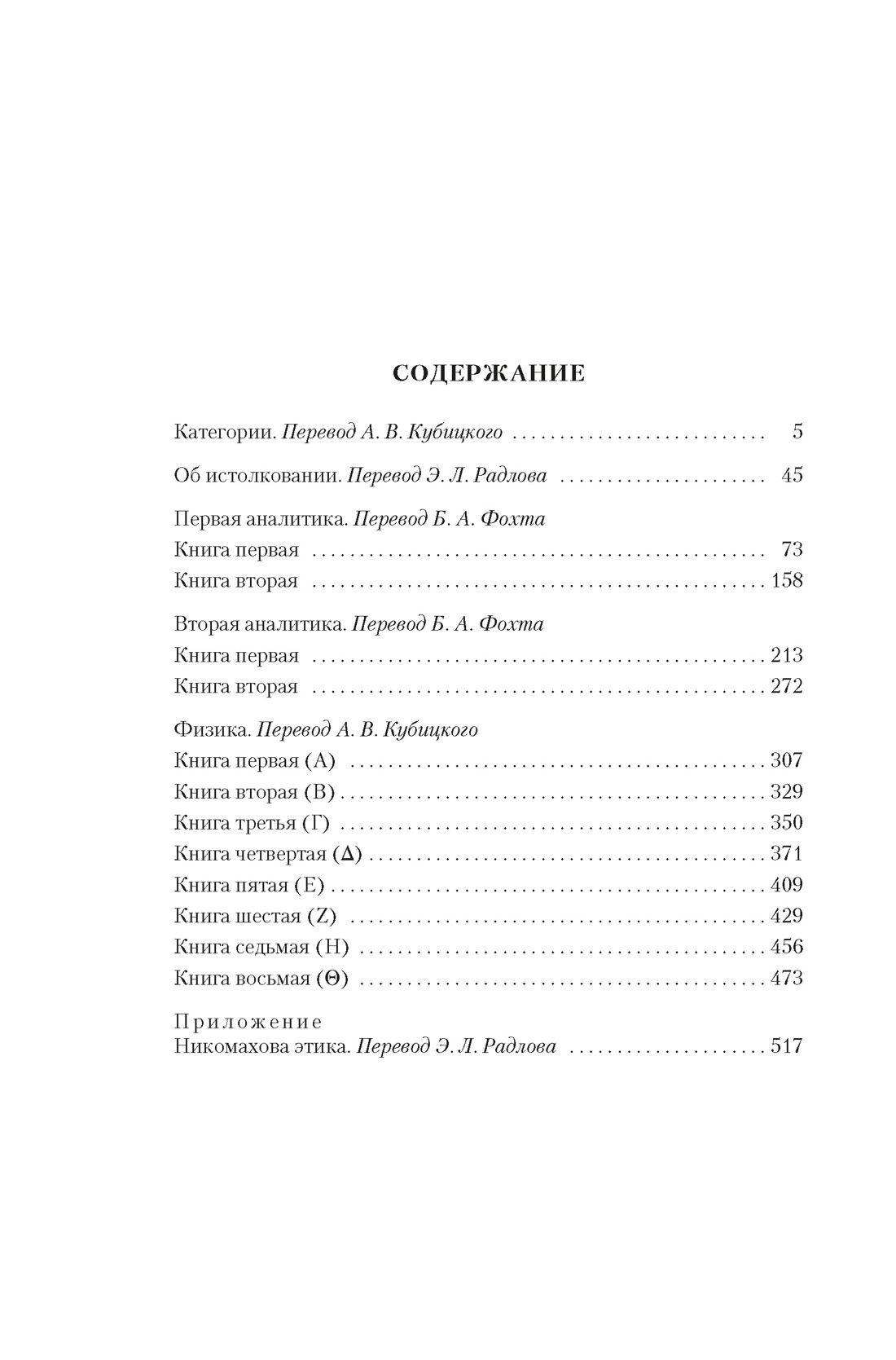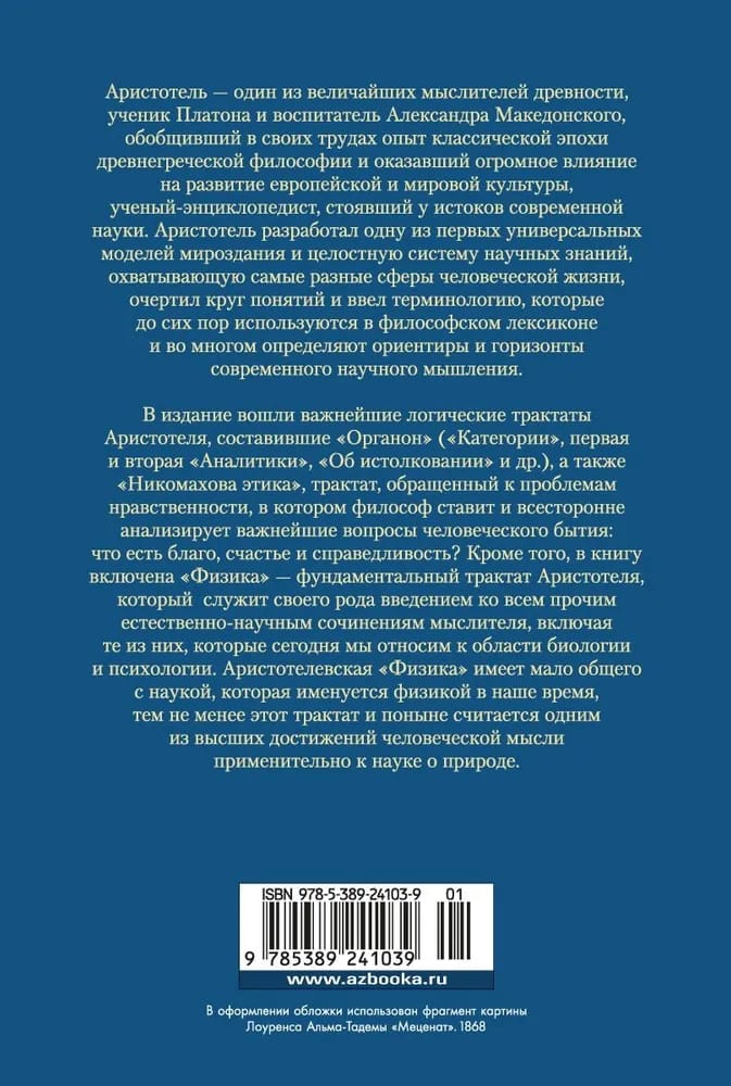Aristotle is one of the greatest thinkers of antiquity, a pupil of Plato and tutor of Alexander the Great, who summarized in his works the experience of the classical era of ancient Greek philosophy and had a great influence on the development of European and world culture, a scientist-encyclopedist who stood at the origins of modern science. Aristotle developed one of the first universal models of the universe and a complete system of scientific knowledge covering the most diverse spheres of human life, outlined the range of concepts and introduced terminology that are still used in the philosophical lexicon and largely determine the guidelines and horizons of modern scientific thinking. The edition includes Aristotle's most important logical treatises that made up the "Organon" ("Categories", the first and second "Analytics", "On Interpretation", etc.), as well as "Nicomachean Ethics", a treatise addressing the problems of morality, in which the philosopher poses and comprehensively analyzes the most important questions of human existence: what is good, happiness and justice? In addition, the book includes "Physics" - Aristotle's fundamental treatise, which serves as a kind of introduction to all other natural-scientific works of the thinker, including those that today we refer to the field of biology and psychology. Aristotle's Physics has little in common with the science that is called physics today, yet this treatise is still considered one of the highest achievements of human thought as applied to the science of nature.