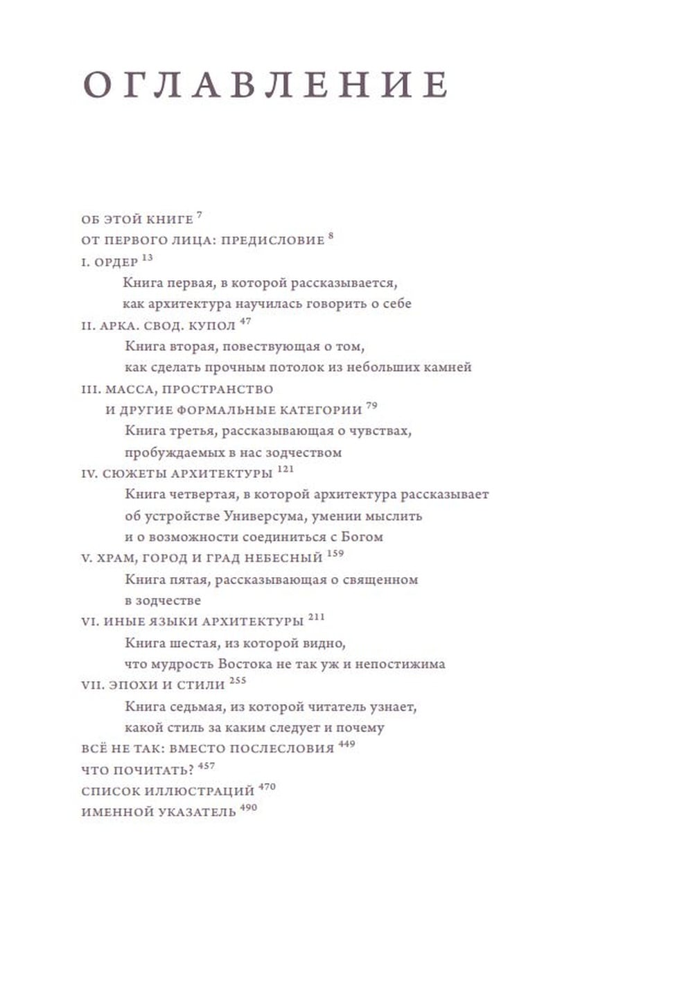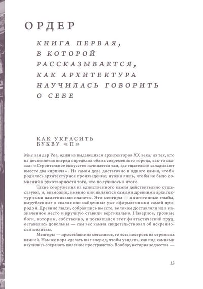 The seven chapters, which the author called "books" in accordance with the long-standing tradition of architectural treatises, tell about the main design solutions, about how the creative will of the architect is directed not only at walls and ceilings, but also at the spaces between them, about how ideas about the structure of the external world and the labyrinths of internal worlds are reflected in architecture.