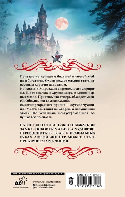 But life and the Universe bring surprises. And here she is already in another world, in the den of black magicians. It's nice that she has magic now. It's a shame it's questionable. Instead of Prince Charming, it's a creepy monster. The place of residence is not a palace, but a neglected castle. But a successful determined girl can do anything. Olesa only needs to escape from the castle, learn magic, and reeducate the monster. After all, in the right hands any monster can become a decent man.