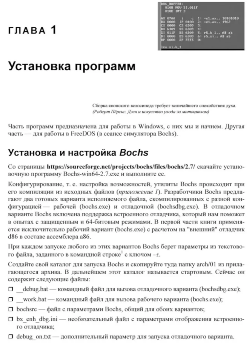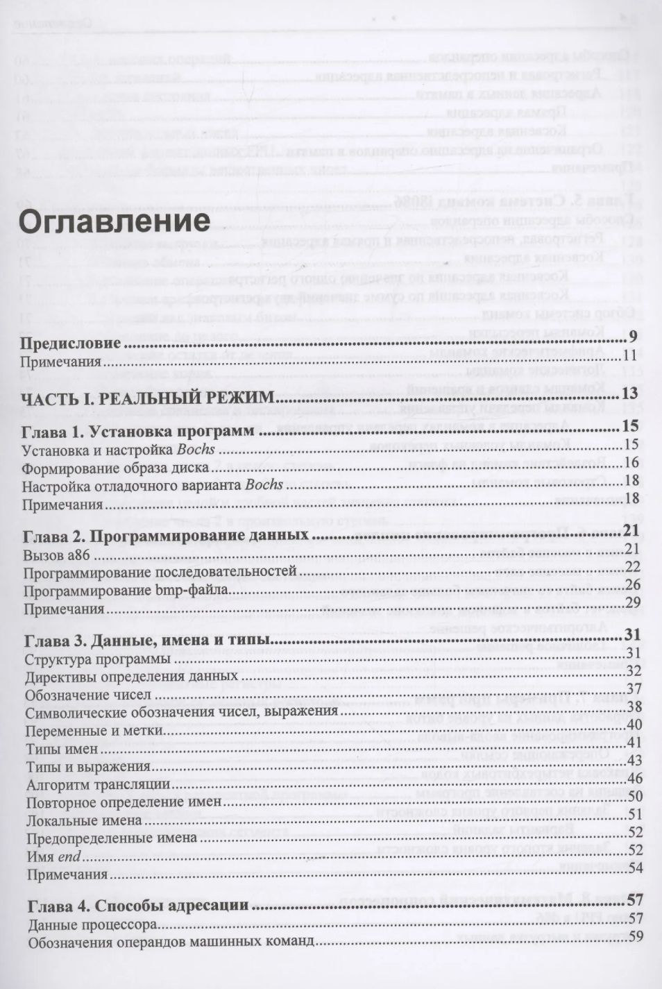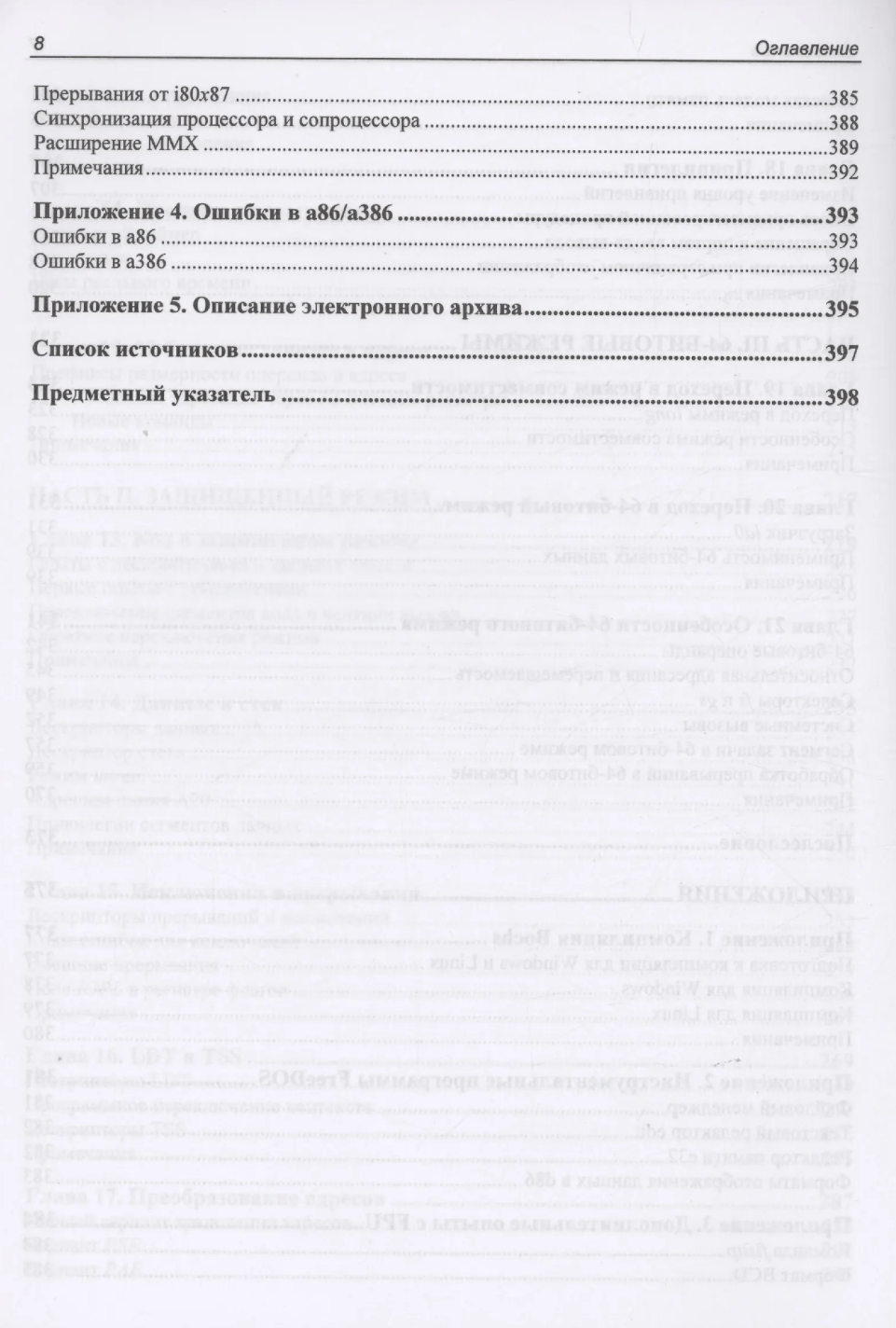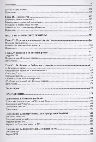 This book is a practical guide to the i80x86/64 processor programming model. The simplest elements of this model (variables, constants, addressing methods, and the instruction set) are explored using the a86 assembler and the d86 debugger. 32-bit i80x86 capabilities, including protected mode, gates, exceptions and interrupts, privileges, paging, exceptions, LDTs, and TSSs, as well as 64-bit x64 processor modes with exceptions and interrupts in long mode, are explored using the nasm assembler.