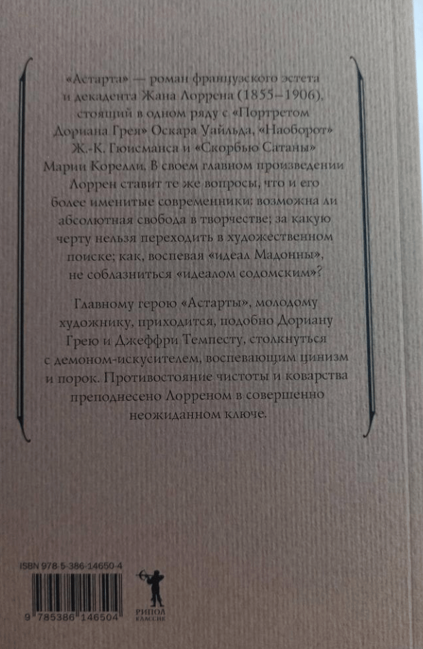 Jean Lorrain (1855-1906) is a name that seems to have been heard somewhere, although few people can boast of having read books by this author. He was once very famous: for the high society of Paris, he was a direct successor to the work of the Goncourt brothers, and for the simpler readers - the embodiment of everything evil and vicious that could arise in modern civilization. "Astarte" - a novel of 1901 and one of the beginnings of modern literature, which no longer shows the complexity and contradictions of the character, but experiments with this character, finding out how he himself can end his complexity.