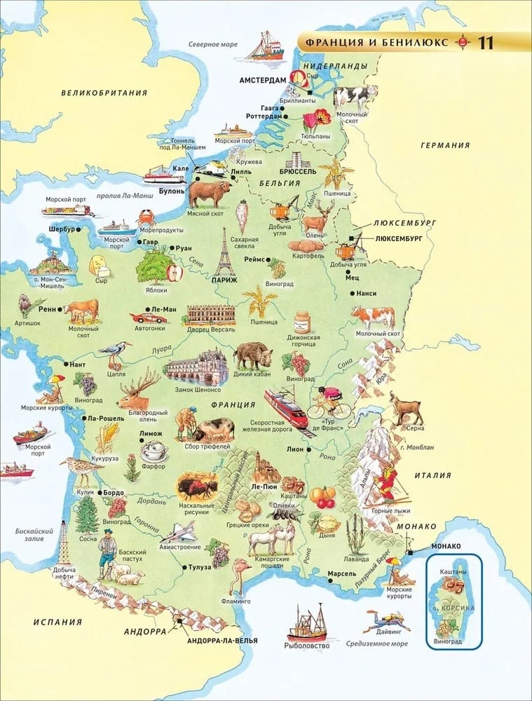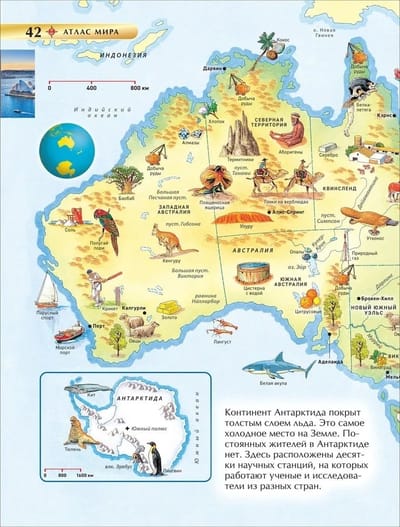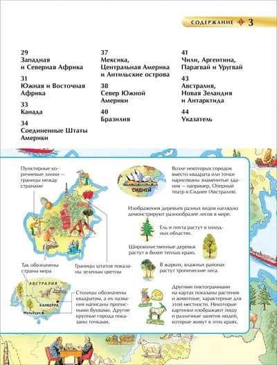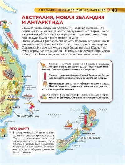 This geographical atlas is a treasure trove of information for schoolchildren! Thanks to the well-thought-out system of pictograms, pupils will quickly and without tedious repetition learn the features of relief, climatic zones and mineral deposits of various countries; memorize the flora and fauna of different corners of the Earth; learn about traditional professions and areas of economy of certain countries; get acquainted with natural wonders of the world, national landmarks and architectural monuments. The "It's a fact!" section will add curious and useful information about the countries of the world to the schoolchildren's knowledge, and the detailed index will help them quickly find the necessary geographical object.