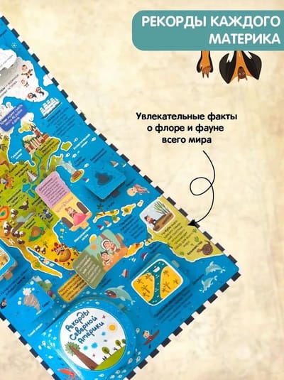 The book "Atlas. Journey through the Continents" from the "Big Encyclopedia" series is a real atlas of the world for your little one. Together with the characters-travelers on the pages of the book, he will visit each continent, learn many interesting facts about it, get acquainted with the flora and fauna, the most interesting and famous sights. The encyclopedia includes a large map of the world, which is convenient for studying states and flags. Colorful illustrations, hundreds of opening windows, interesting facts - go on a round-the-world trip with the book "Atlas. Journey through the Continents".