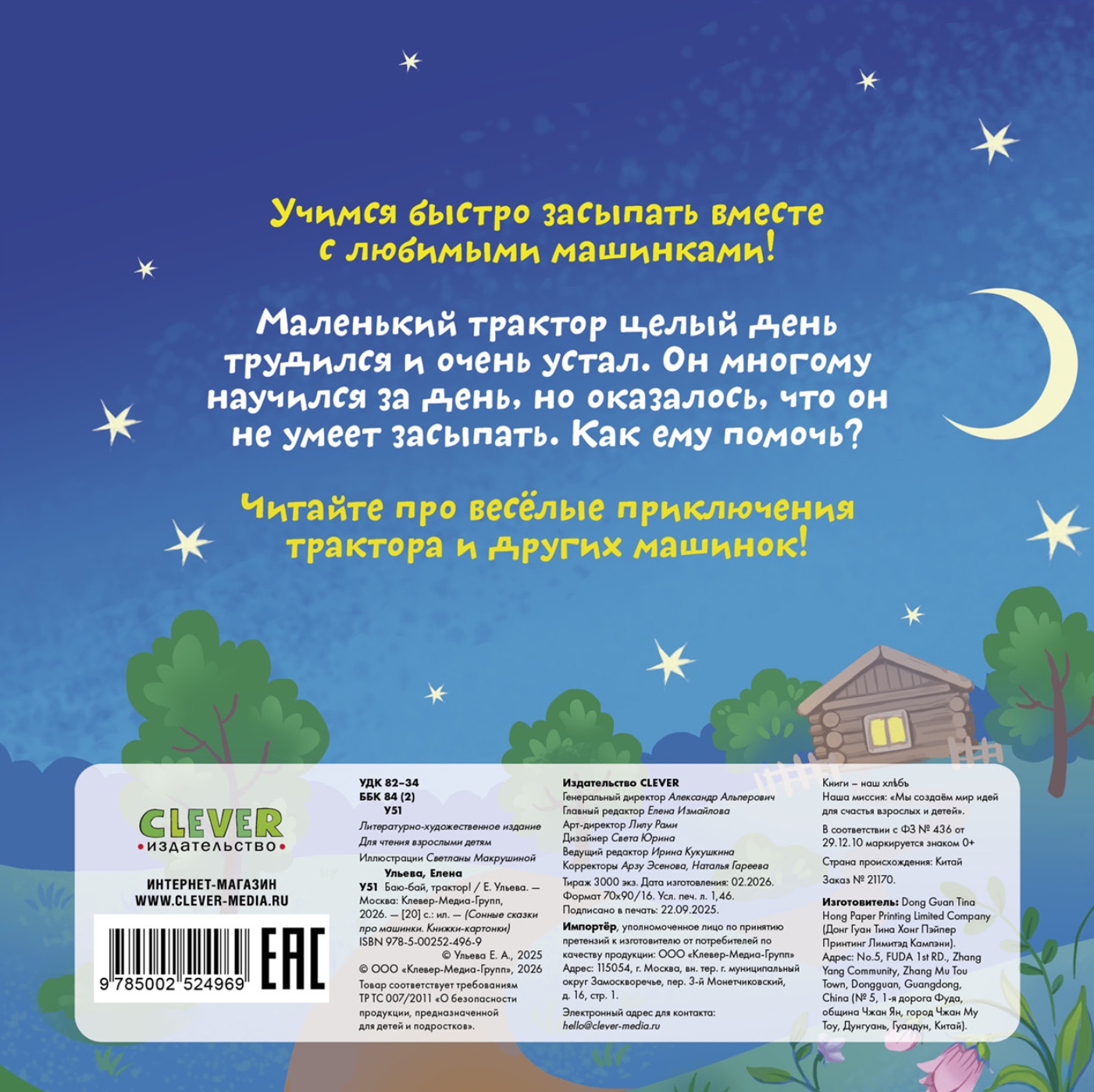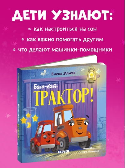 "Bye-Bye, Tractor!" is a kind and educational bedtime board book with bright, engaging illustrations. The book ends with interactive activities and a bedtime rhyme.