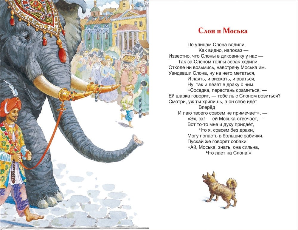The book includes Krylov's most famous fables: "The Wolf and the Lamb", "The Elephant and the Moss", "The Dragonfly and the Ant", "Quartet", "Demyan's Ear", "The Cuckoo and the Cock", "The Elephant on the Province", "The Wolf in the Kennel", "Trishkin Kaftan" and many others.