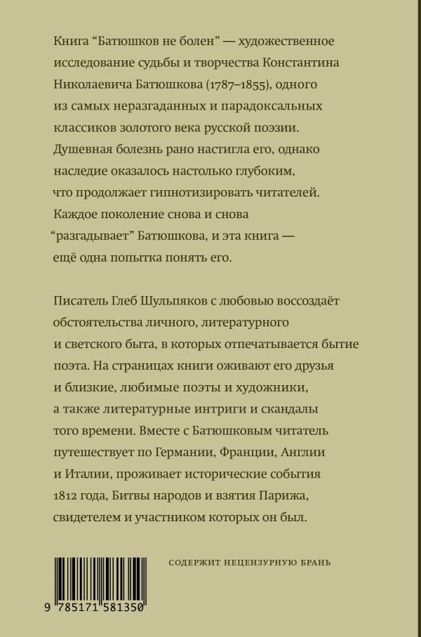 The book "Batiushkov is not sick" - an artistic study of the fate and work of Konstantin Nikolayevich Batiushkov (1787-1855), one of the most unsolved and paradoxical classics of the golden age of Russian poetry. Soul illness caught up with him early, but his legacy was so profound that it continues to hypnotize readers. Each generation "unravels" Batiushkov again and again, and this book is another attempt to understand him.