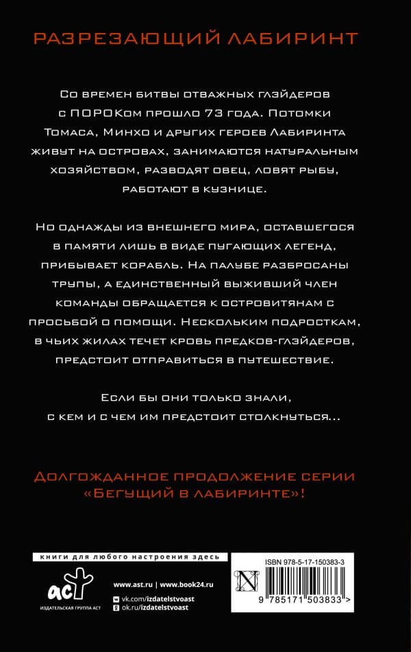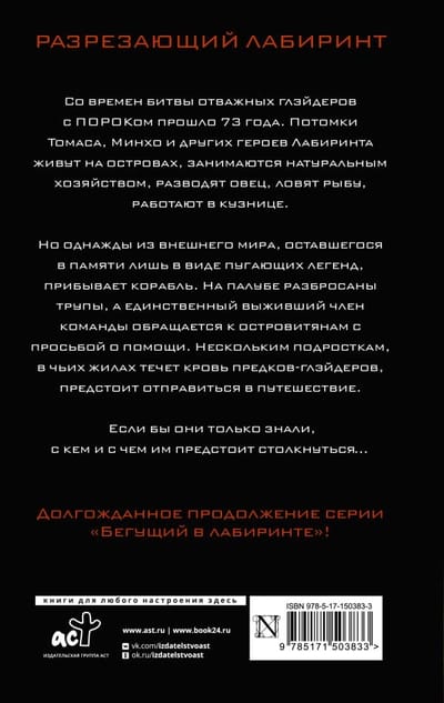 Seventy-three years have passed since the battle between the brave gliders and POROK. The descendants of Thomas, Minho and other heroes of the Labyrinth live on the islands, practicing subsistence farming, raising sheep, fishing, and working in the blacksmith shop. But one day, a ship arrives from the outside world, which remains in their memories only in the form of frightening legends. Corpses are strewn across the deck, and the sole surviving crew member appeals to the islanders for help. A few teenagers with the blood of their glider ancestors in their veins must embark on a journey. If only they knew who and what they would face....