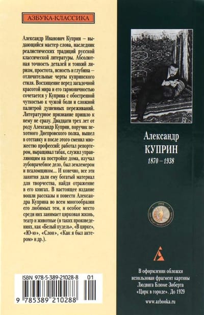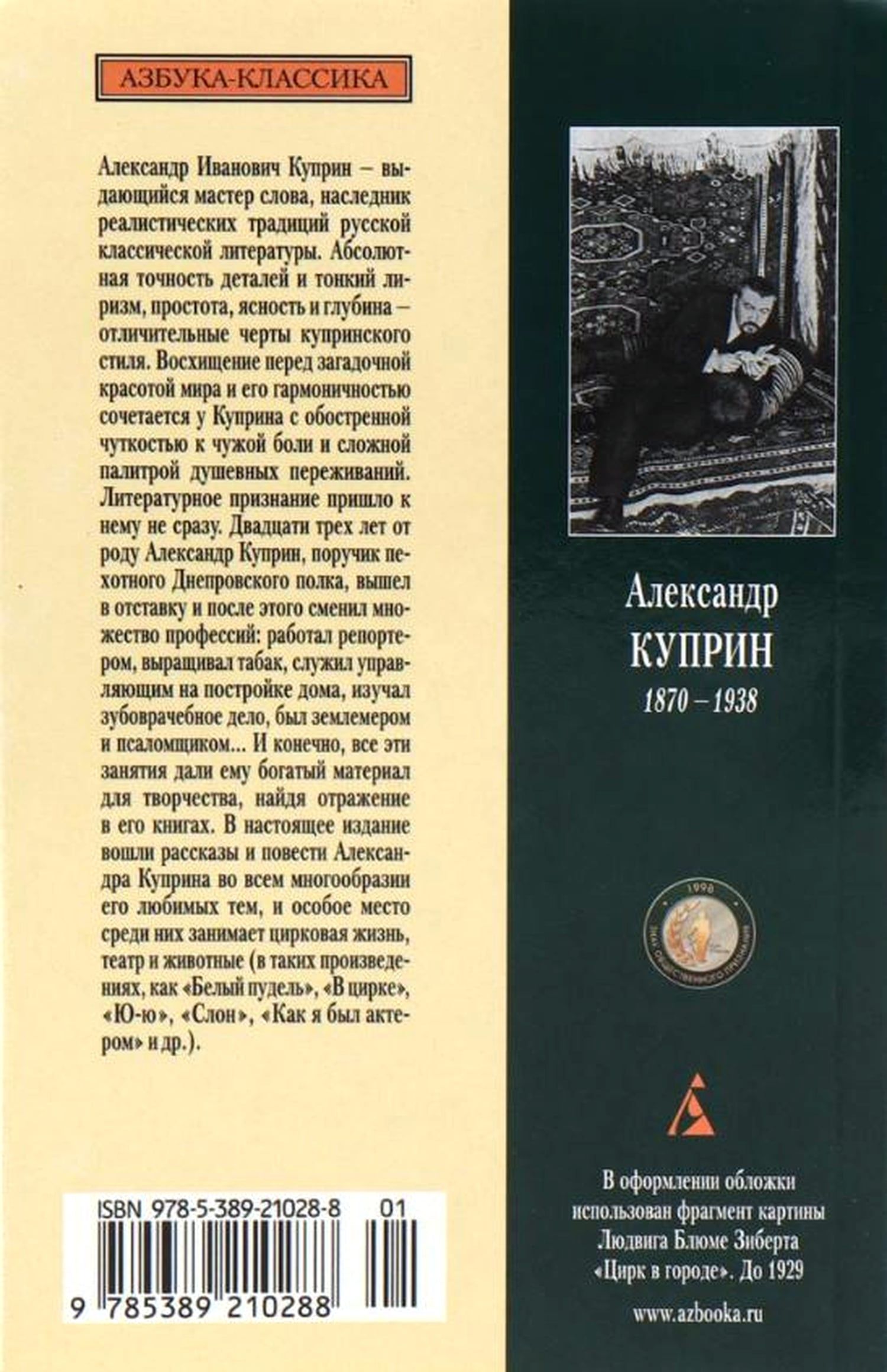 Alexander Ivanovich Kuprin is an outstanding master of words, an heir to the realistic traditions of classical Russian literature. Absolute precision of detail and subtle lyricism, simplicity, clarity, and depth are the hallmarks of Kuprin's style. Kuprin's admiration for the mysterious beauty of the world and its harmony is combined with a heightened sensitivity to the pain of others and a complex palette of emotional experiences. Literary recognition did not come to him immediately. At the age of twenty-three, Alexander Kuprin, a lieutenant in the Dnieper Infantry Regiment, retired and subsequently held numerous professions: he worked as a reporter, grew tobacco, served as a superintendent on a house construction project, studied dentistry, worked as a land surveyor, and served as a psalm reader. And, of course, all these activities provided him with rich creative material, reflected in his books. This edition includes stories and novellas by Alexander Kuprin in all the diversity of his favorite themes, and a special place among them is occupied by circus life, theater and animals (in such works as “The White Poodle,” “At the Circus,” “Yu-Yu,” “The Elephant,” “How I Was an Actor,” etc.).