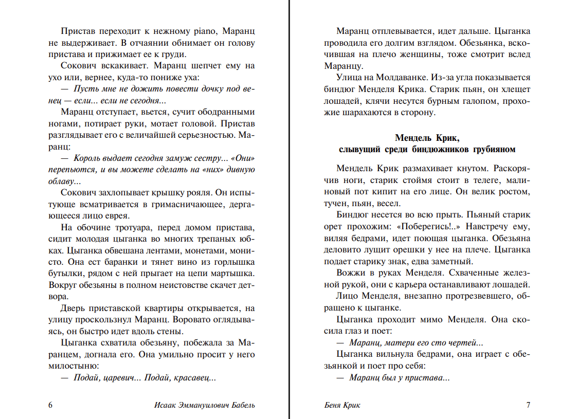 The noble Odessa bandit Benya Krik remains one of Isaac Babel's most famous literary characters to this day. Like all of Babel's prose, "Benya Krik" is imbued with the colloquial tone of Odessa: it allows the reader to immerse themselves not only in its visual but also in its acoustic imagery during the revolutionary period.