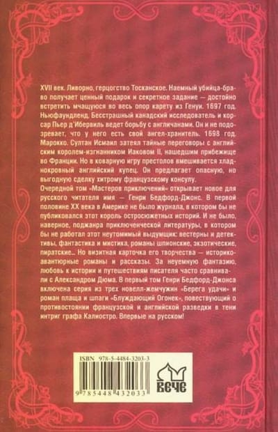 The next volume of "Masters of Adventure" reveals a new name for the Russian reader - Henry Bedford-Jones. In the first half of the 20th century, there was no magazine in America that did not publish this king of action-packed stories. And there was probably no subgenre of adventure literature that this tireless inventor did not work in: westerns and detectives, fantasy and mysticism, spy novels, exotic novels, pirate novels... But the calling card of his work is historical adventure novels and stories. For his irrepressible imagination, love of history and travel, the writer was often compared to Alexandre Dumas. The first volume of Henry Bedford-Jones includes a series of three pearl short stories, "The Shores of Fortune," and the cloak-and-dagger novel "Will-o'-the-Wisp," which tells of the confrontation between French and English intelligence in the shadow of Count Cagliostro's intrigues.