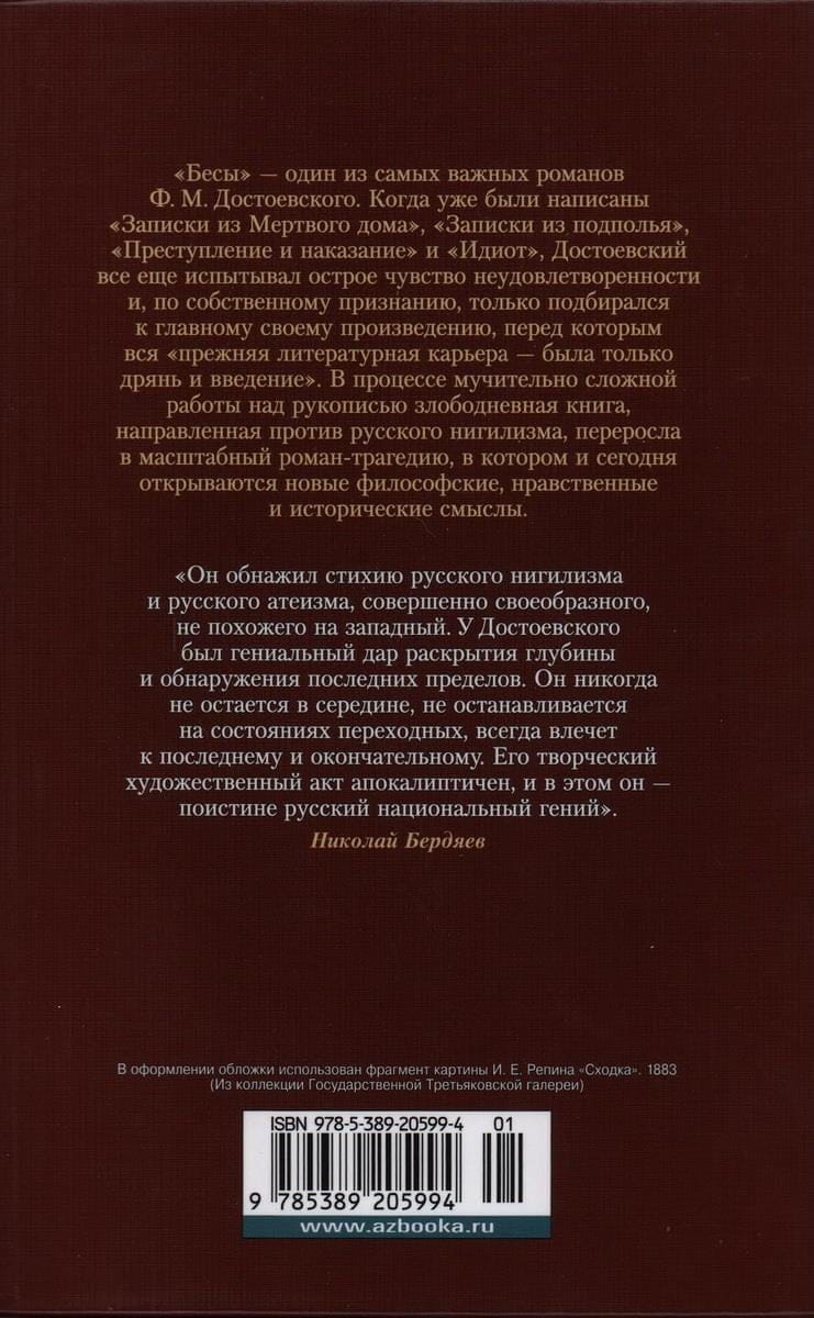 "Besy" is one of the most important novels of F. M. Dostoevsky. When already written were "Notes from the Dead House", "Notes from Underground", "Crime and Punishment" and "The Idiot", Dostoevsky still felt an acute sense of dissatisfaction and, by his own admission, only approached his main work, before which the whole "previous literary career - was only trash and introduction". In the process of painfully difficult work on the manuscript, a topical book directed against Russian nihilism, grew into a large-scale novel-tragedy, which even today opens new philosophical, moral and historical meanings.
