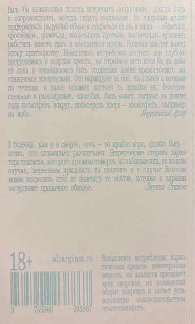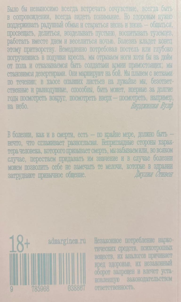 In her essay "Being Sick" (1926), Virginia Woolf addresses the question: why is illness—an everyday and integral part of human life—so inexcusably underrepresented? According to the writer, who herself suffered from physical ailments, a person forced to be cut off from the familiar world and confined to bed gains a completely different perspective. For Woolf, illness is a springboard that allows one to break free from conventional wisdom, the "welcoming deception" of society, and to perceive the world outside the norm, as if from within. In her view of illness, she diverges from that of her mother, Julia Stephen, an experienced nurse and author of the practical guide "Notes from Sickrooms" (1883). Both texts are published in Russian for the first time and introduce readers to two different ways of writing about illness from two very different women.