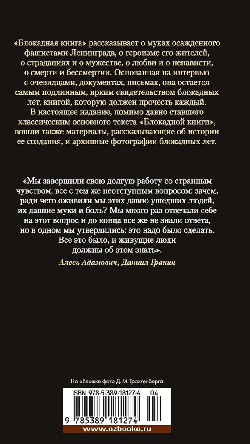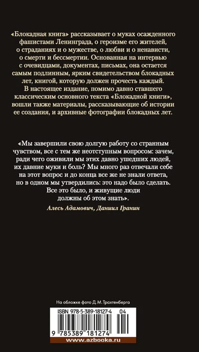"Blockade Book" tells about the agony of besieged Leningrad, about the heroism of its inhabitants, about suffering and courage, about love and hate, about death and immortality. Based on interviews with eyewitnesses, documents, letters, it remains the most authentic, vivid testimony of the siege years, a book that everyone should read. This edition, in addition to the long-standing classic main text of the "Blockade Book", also includes materials about the history of its creation and numerous archival photographs of the blockade years.
