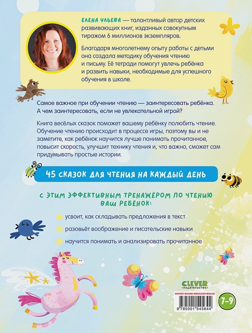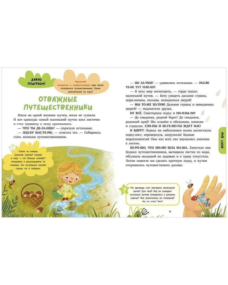 "The First Grader's Big Book of Reading" - this book of fun tales. It will help your child to love reading, because learning happens in the process of play. You won't even notice how your child will learn better reading comprehension, increase speed, improve reading technique and, importantly, be able to make up simple stories on his own. In the book you will find 45 fun stories for reading, by them the child will learn to read well by syllables, improve technique and increase reading speed, increase vocabulary before school. Several short fascinating short stories will not cause difficulties for beginning readers. Interesting plots and bright illustrations will interest the child, and additional tasks, questions and games will help adults to check how the child understood the content, develop emotional intelligence, creativity, writing skills, and help to consolidate the acquired skills. The young student will be delighted to immerse himself in the study of texts, having received the task, for example, to guess only by the highlighted words, what the story will be about. A detailed guide and instructions on how to use the book have been prepared for parents. Useful tips are sure to come in handy during the game. The effect of such reading is proven: the child will begin to recognize folds well and make words from them, will read any unfamiliar words meaningfully, will expand his horizons, will learn many new words, will learn to think creatively and analyze the text.