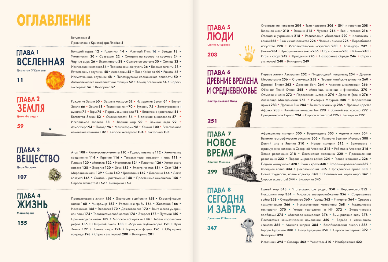 The Encyclopedia Britannica has been published since 1768, and has always inspired curiosity and a thirst for knowledge in readers of all ages. The book you hold in your hands, the new Encyclopedia Britannica, continues this tradition. Unlike the encyclopedias of old, which were compiled from A to Z, this encyclopedia will take you on a journey from the beginning of time to the present day - and even let you look into the future! The book is divided into eight large chapters on the topics: the Universe and space, planet Earth, science, the origin of life, the human body, ancient history, and modern and contemporary times. A huge number of experts worked on each chapter of the new Encyclopedia Britannica, and every fact in it is confirmed by specialists. More than 1,000 unique illustrations and photographs were commissioned especially for this book and are sure to amaze your imagination. For middle school age.