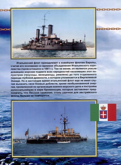 The Italian navy belongs to the newest navy in Europe, counting its foundation since the unification of the Kingdom of Italy in 1861. Nevertheless, it inherited the naval exploits of all the peoples who inhabited the peninsula, starting with the Romans. But in the middle of the XIX century, the Italian navy had not yet had the opportunity to show its fighting prowess other than by demonstrating the extraordinary energy shown in the organization of naval affairs and the construction of colossal battleships, which made us assume that a battle like that of Liss, so successful for the Austrian fleet, will not happen again.