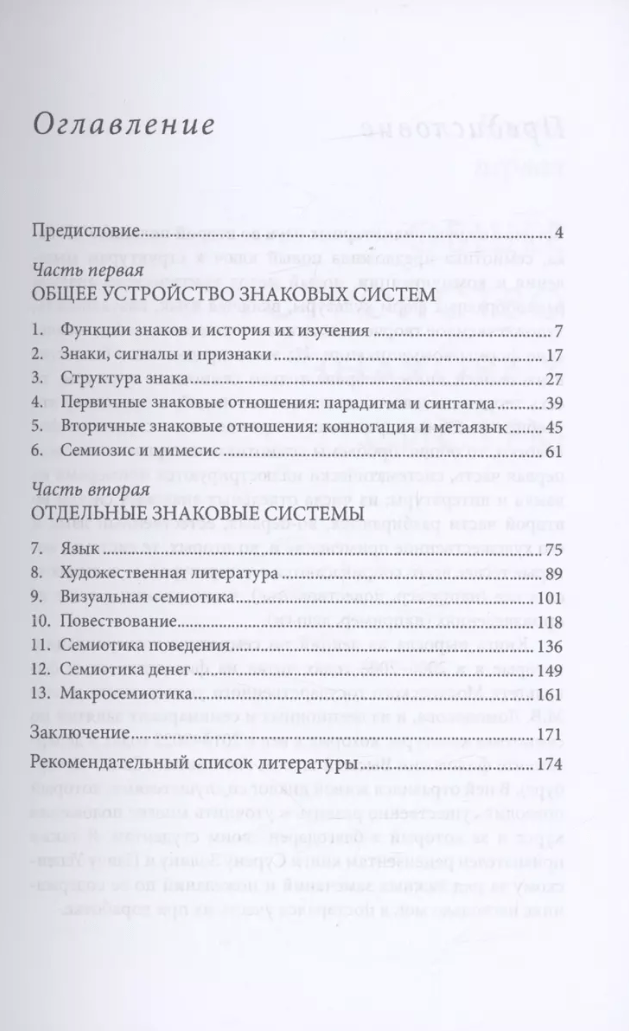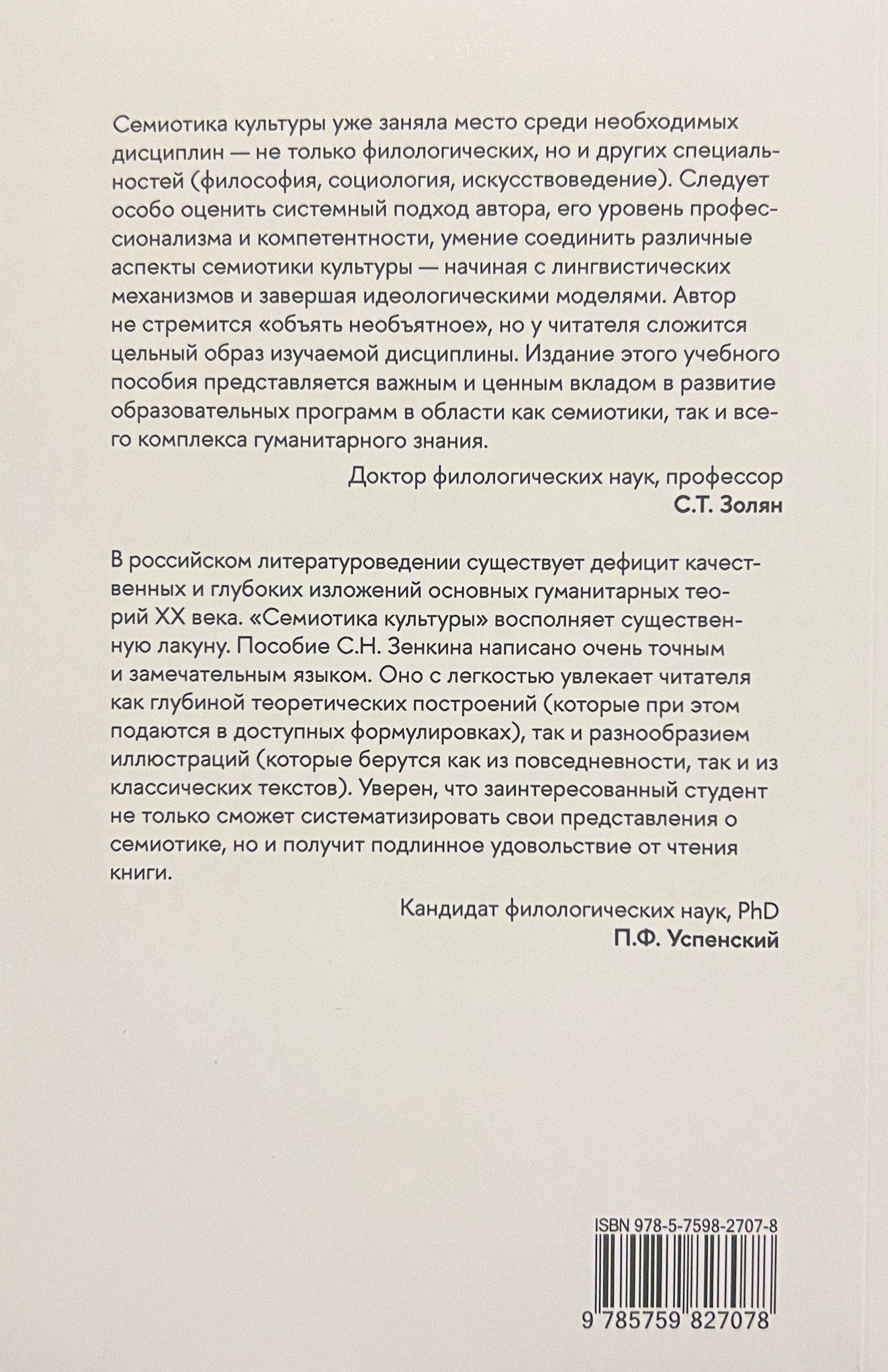 The textbook contains a systematic presentation of the main provisions of cultural semiotics, a discipline that had an exceptional influence on the development of the world's humanities in the second half of the twentieth century. The general problems of semiotics - the definition and structure of the sign, primary and secondary sign relations, semiosis and mimesis - are considered, as well as a number of specific sign systems, most often touched upon in the study of word culture (language and literature, visual systems, narrative, semiotic aspects of behavior and monetary circulation, the general structure of sign culture). The ideas of leading semiotic theorists such as Roland Barthes, Umberto Eco, Yuri Lotman and others are outlined. The theoretical presentation is accompanied by numerous examples, mostly taken from language, fiction and other arts. The book is recommended for undergraduate and graduate students of philology, as well as postgraduate students.