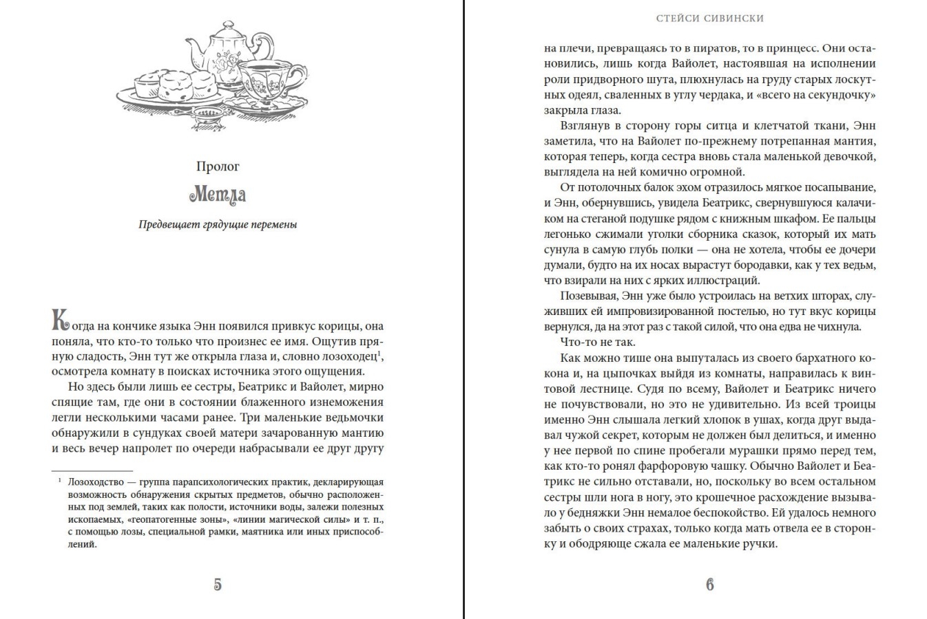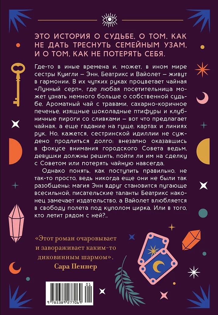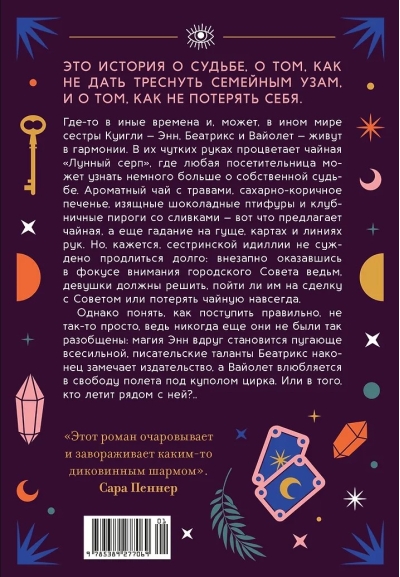 Somewhere in another time, perhaps in another world, three sisters, Anne, Beatrix, and Violet Quigley, live in harmony. Under their watchful eye, the Moon Crescent Tearoom thrives, where any visitor can learn a little more about their own destiny. Aromatic herbal teas, cinnamon-sugar cookies, elegant chocolate petits fours, and strawberry cream tarts—that's what the tearoom offers, along with fortune telling using grounds, cards, and palm readings. But it seems their sisterly idyll is destined to be short-lived: suddenly finding themselves the focus of the town's Witches' Council, the girls must decide whether to make a deal with the Council or lose the tearoom forever. But understanding what is right is not so simple, because never before have they been so separated: Anne's magic suddenly grows alarmingly, Beatrix's writing talents are finally noticed by a publishing house, and Violet falls in love with the freedom of flying under the circus dome, or perhaps with the one who is flying under it next to her... This is a story about fate, about how to prevent family ties from cracking, and about how not to lose yourself.