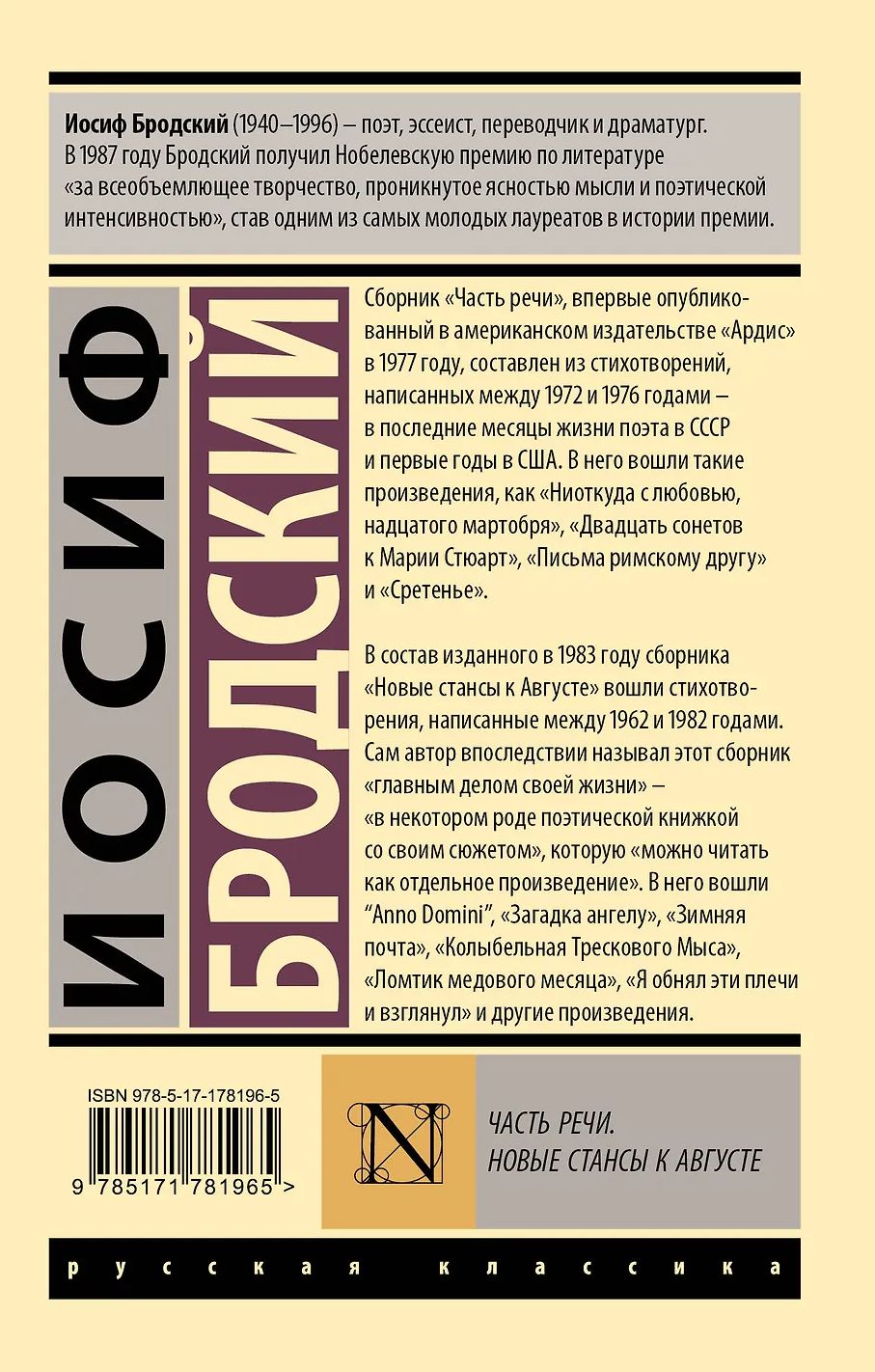 The collection "Part of Speech," first published by the American publisher Ardis in 1977, is composed of poems written between 1972 and 1976—the poet's final months in his homeland and his first years in exile.