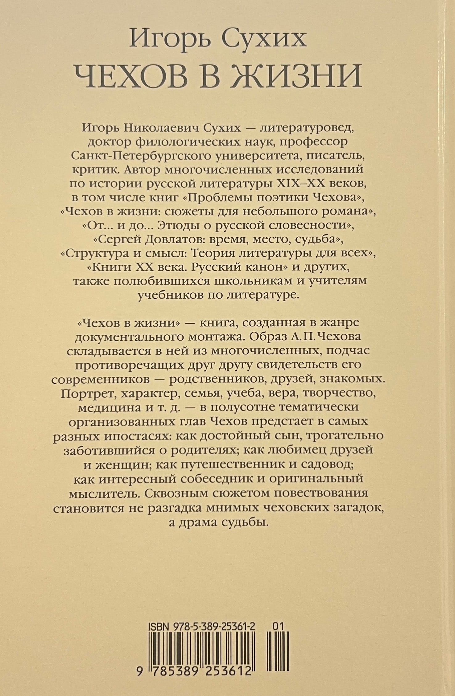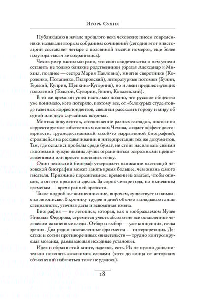 "Chekhov in Life" - a book created in the genre of documentary montage. The image of Chekhov is formed in it from numerous, sometimes contradictory testimonies of his contemporaries - relatives, friends and acquaintances. Portrait, character, family, studies, faith, creativity, medicine, etc. - In half a hundred thematically organized chapters Chekhov appears in a variety of different hypostases: as a worthy son, touchingly caring for his parents; as a favorite of friends and women; as a traveler and gardener; as an interesting conversationalist and original thinker. The cross-cutting plot of the narrative is not the unraveling of Chekhov's imaginary riddles, but the drama of fate. Igor Nikolaevich Sukhikh, a well-known literary scholar, doctor of philological sciences, professor at St. Petersburg University and one of the best researchers of Chekhov's work.