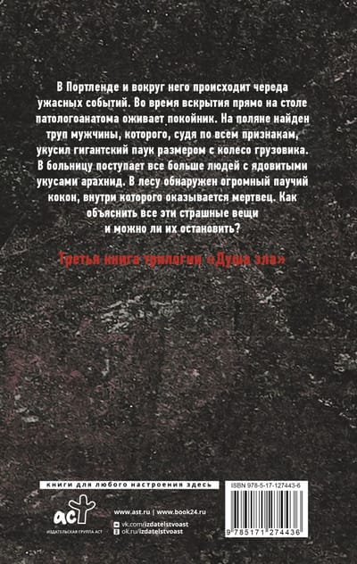 In and around Portland, a series of horrific events take place. During an autopsy, a dead man comes to life right on the pathologist's table. A man is found dead in a clearing, bitten by a giant spider the size of a truck tire by all accounts. More people are being admitted to the hospital with venomous arachnid bites. A huge spider cocoon is discovered in the woods, and a dead man is found inside. How to explain all these terrible things and can they be stopped? The third book of the Soul of Evil trilogy.