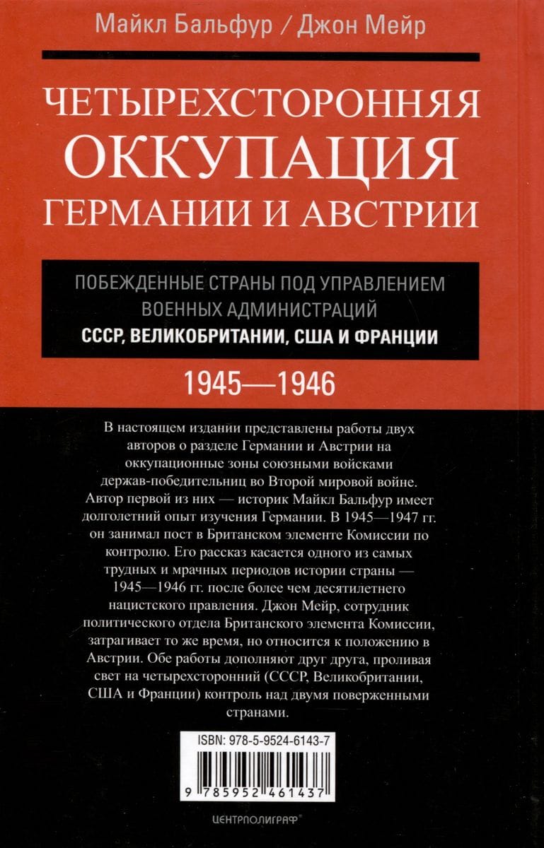 This edition presents the work of two authors on the division of Germany and Austria into occupation zones by the Allied forces of the victorious powers in World War II. The author of the first, historian Michael Balfour, has a long experience of German studies. Between 1945 and 1947 he held a post on the British element of the Control Commission. His account deals with one of the most difficult and darkest periods of the country's history, 1945-1946, after more than a decade of Nazi rule. John Mair, a political officer in the British Element of the Commission, touches on the same time but relates to the situation in Austria. Both works complement each other, shedding light on the quadripartite (USSR, UK, US and France) control of the two defeated countries.