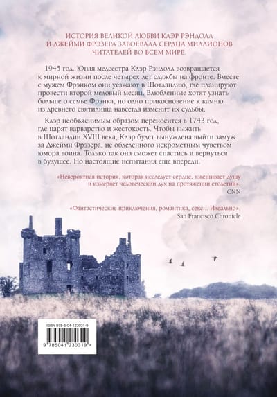Claire is inexplicably transported to 1743, a time of barbarity and cruelty. To survive in 18th-century Scotland, Claire will be forced to marry Jamie Fraser, a warrior with a sparkling sense of humor. Only then will she be able to escape and return to the future. But the real trials are yet to come.