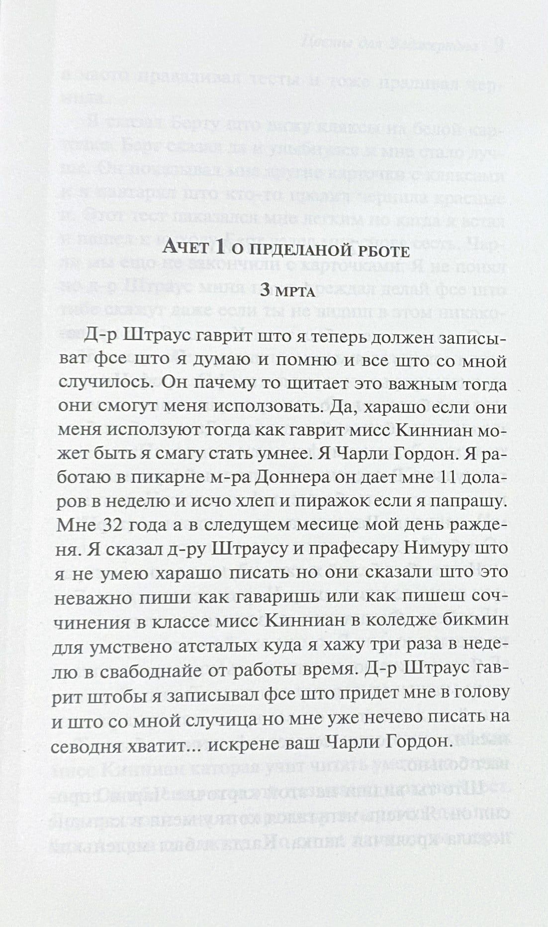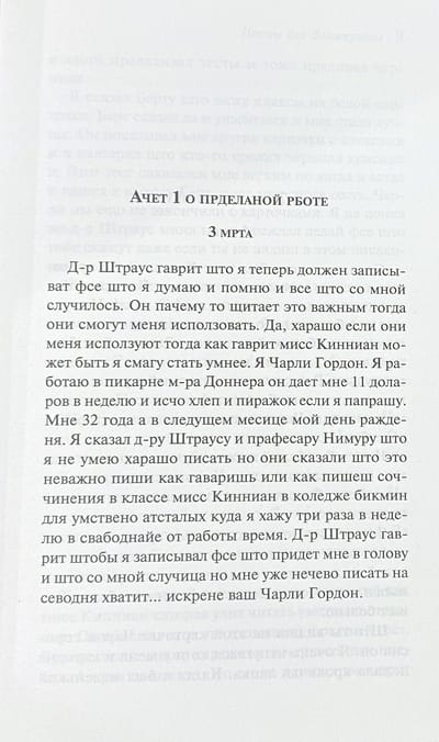 The changes in Charlie Gordon are happening before our eyes, here and now. The first reports are full of spelling mistakes, it is very difficult for him to express his thoughts, gradually he begins to write correctly and tell about events perfectly.