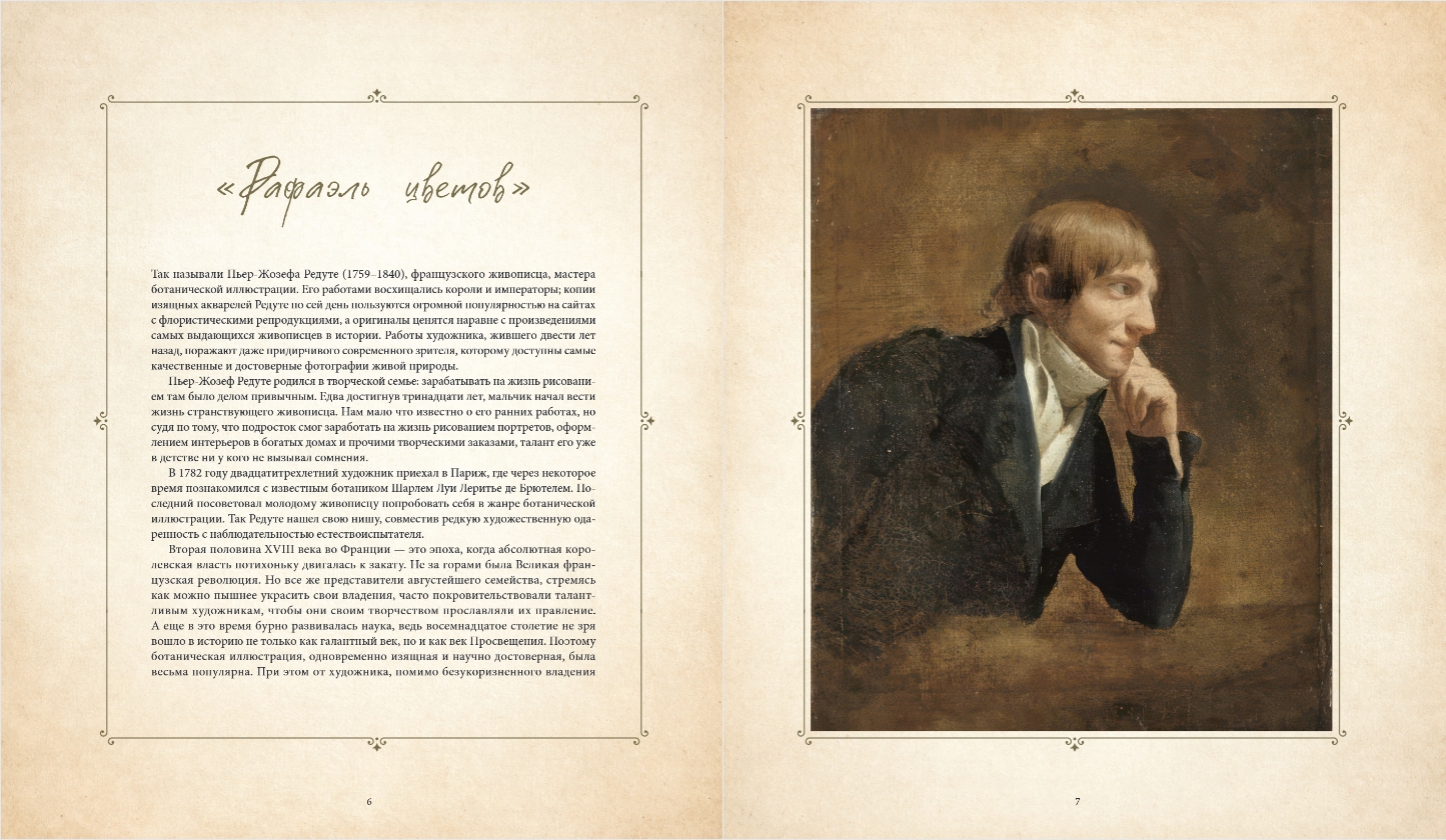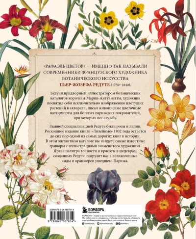 Luxurious roses, gorgeous lilies and irises are the queens of any garden! Botanical illustrations by the famous French artist Pierre-Joseph Redouté are true masterpieces in the world of art. "Raphael of flowers" - that's what contemporaries called the favorite of the French court of the XVIII century. As a court illustrator of botanical catalogs of Queen Marie Antoinette, the artist devoted himself exclusively to the depiction of flowering plants in watercolor, wrote picturesque floral still lifes for wealthy Parisian patrons, with whom he served. Redoute's main specialty was roses and lilies. A sumptuous 1802 edition of The Lilies remains to this day one of the most expensive books in history. The artist attracted the attention of the French elite of the 18th and 19th centuries, traveling with botanical expeditions and creating stunning illustrations for the flora and fauna catalogs of the Museum of Natural History. As Marie Antoinette's court painter, Raphael of Flowers weathered political storms and, thanks to his talent, received the patronage of Napoleon's wife Josephine. This book contains selected works by the artist, allowing you to experience the botanical splendor of the beautiful Paris of the past, accessible only to the bygone French high society. Delve into the world of beauty and grace that Pierre-Joseph Redouté created and enjoy exploring his creations. The floral illustrations adorning each page of this book will allow you to enjoy the unique charm of nature captured on canvas and preserved in history.