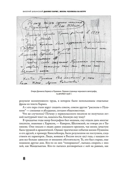 Daniil Kharms (Yuvachev; 1905–1942) was one of the key figures in Russian literature of the last century, a major representative of the Russian and world avant-garde of the 1920s–1930s, a famous children's writer, a man whose appearance and lifestyle gave rise to legends and jokes. The biography of D. Kharms was written based on his own diaries and notes, the memoirs of people close to him, as well as archival materials, and contains a number of new facts concerning the writer and his family. The book's heroes were Kharms's comrades in OBERIU (Association of Real Art) — Alexander Vvedensky, Nikolai Oleinikov, and Nikolai Zabolotsky, and his intellectual interlocutors — philosophers Yakov Druskin and Leonid Lipavsky. Among more than two hundred illustrations are reproductions of drawings and photographs by Kharms and his contemporaries. Valery Shubinsky published many unique documents for the first time.