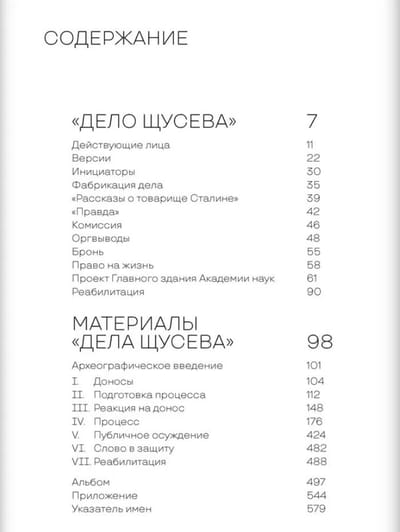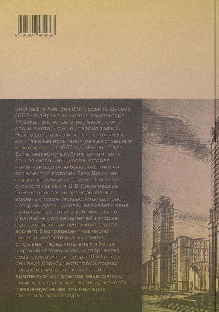 Historian Peter Druzhinin, a senior researcher at the Vinogradov Institute of Russian Language of the Russian Academy of Sciences, on the basis of various archival sources, restores the history of the Shchusev case, names not only those who fabricated it, but also those party leaders who sanctioned the public persecution of the architect. An unprecedented number of previously unknown documents reveals to the reader a broader picture of the life and work of Soviet architects in the 1930s: a frenzied struggle of ambition, sometimes intractable issues of authorship of architectural projects, the incredible complexity of relationships, jealousy and mutual hatred of masters of Soviet architecture.