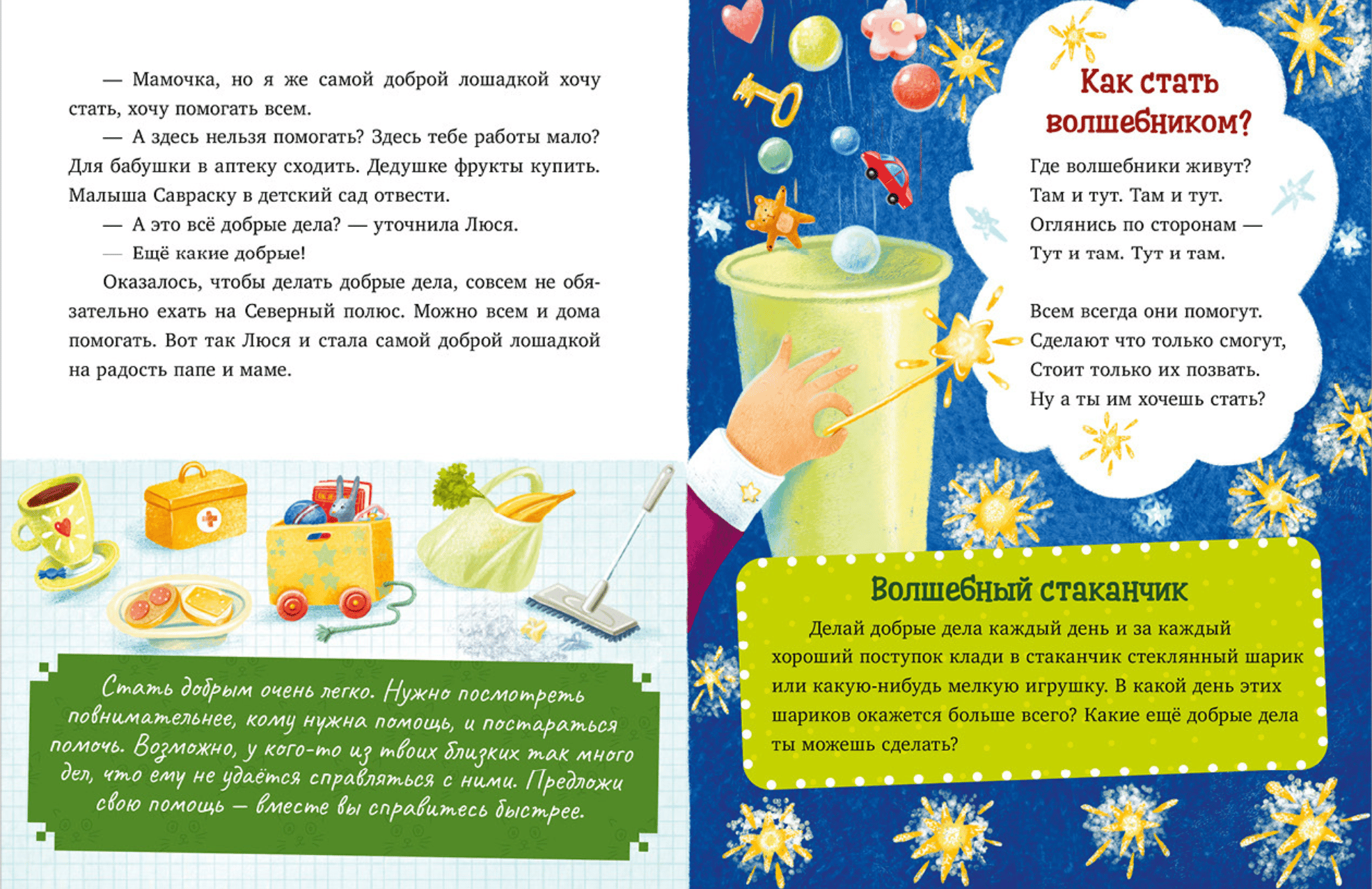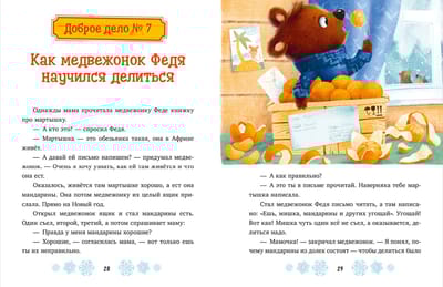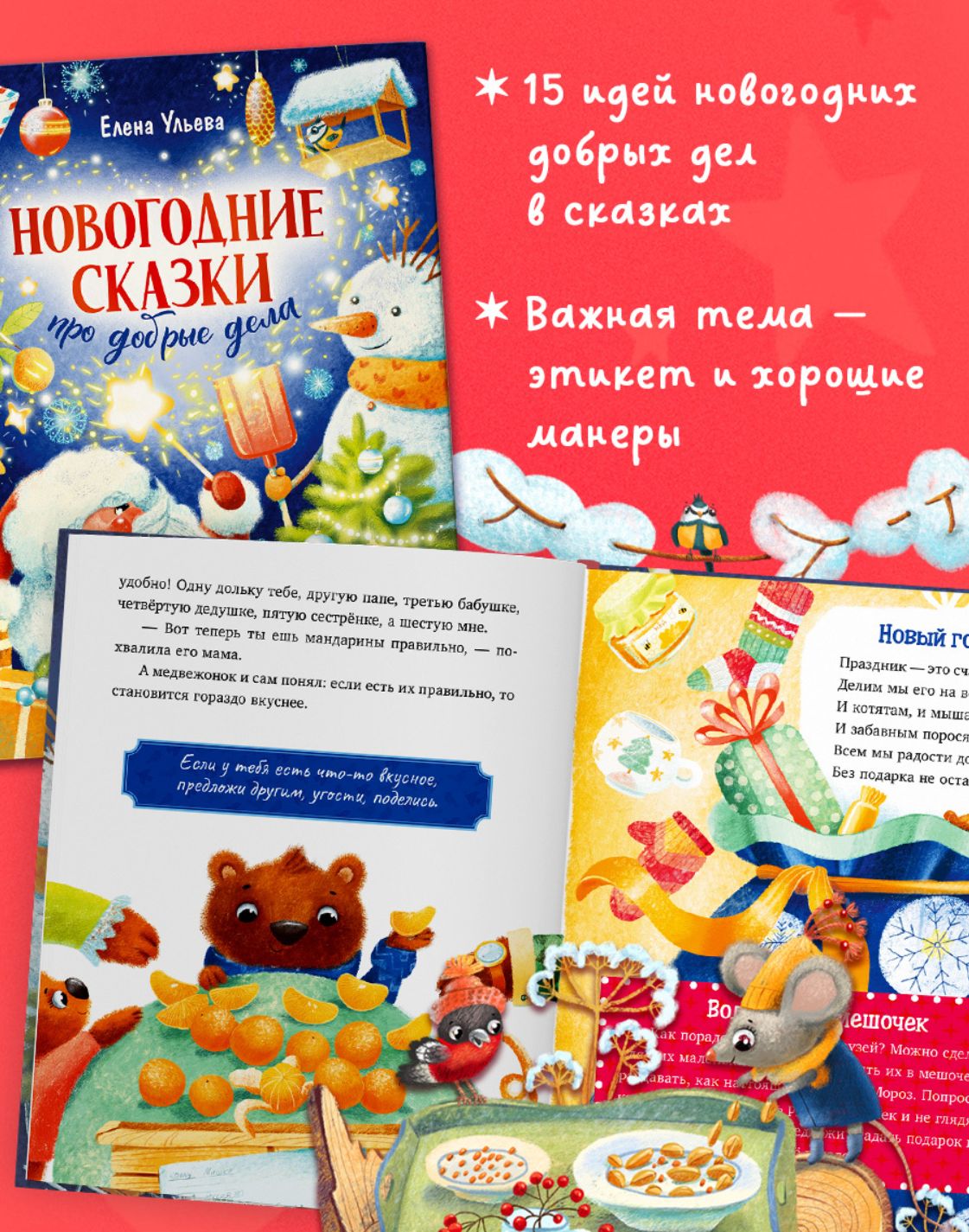 Inside the children's book "New Year's Fairy Tales about Kind Deeds," you'll find: