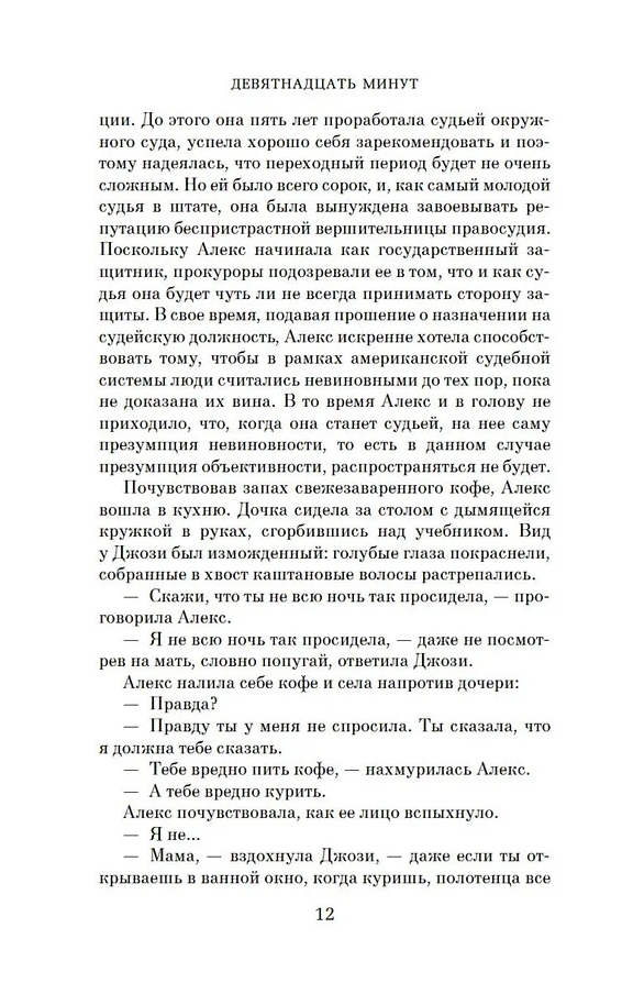 In nineteen minutes, you can mow your lawn, dye your hair, or bake scones for breakfast. In nineteen minutes, you can stop the earth or jump from it. In nineteen minutes, you can achieve revenge. Sterling is a sleepy provincial town in New Hampshire. One day, its quiet life is shattered by gunfire at the high school. And to survive this event, justice is not enough. For the residents of Sterling, the line between truth and fiction, good and evil, one's own and another's is forever blurred. Josie Cormier, the judge's daughter, could have been a valuable witness for the prosecution, but she doesn't remember what happened before her eyes, and the facts that emerge during the trial cast a shadow of guilt on both students and adults, destroying even the strongest friendships and family ties. The novel "Nineteen Minutes" poses simple questions that have no simple answers. Is it possible not to know your own child? What does it mean to be different? Is a victim's desire to strike back justified? And who is to judge, if any of us even has the right to judge another?