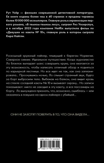 "The Girl in Cabin 10" gracefully balances classic detective fiction and psychological thriller, combining a mysterious atmosphere with a tense pace. The protagonist, journalist Lo Blacklock, is given the chance to travel on a luxury cruise liner bound for Norway. It seems like a wonderful opportunity to have a great time and advance her career by writing an original review. But on her very first night, Lo awakens to strange sounds in the next cabin, then hears a splash—as if a body had been thrown overboard. Running out onto the balcony, the girl sees blood on the glass of cabin #10. However, the guards find nothing, and Lo is forced to take on the case herself, which is much more dangerous than it seems at first glance.