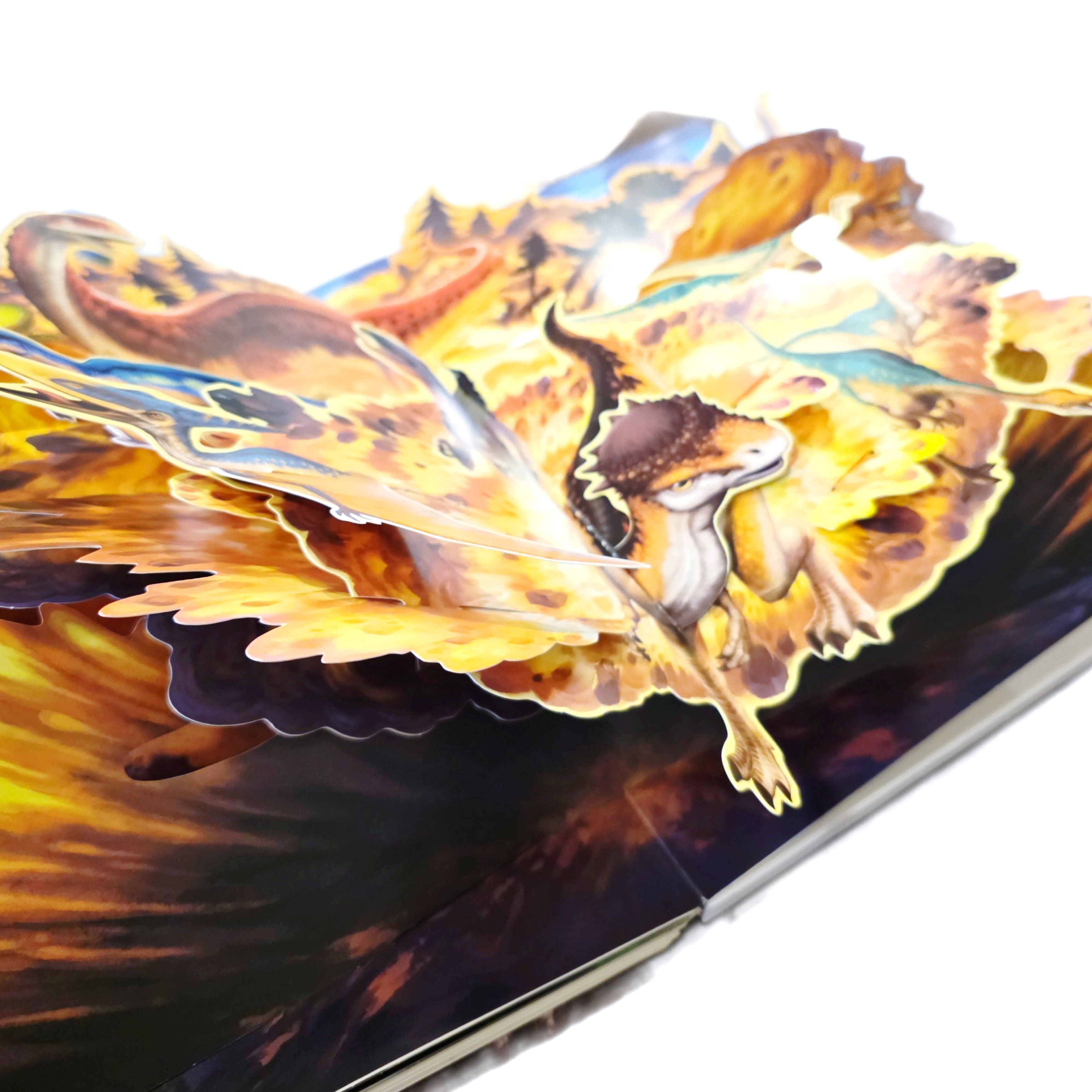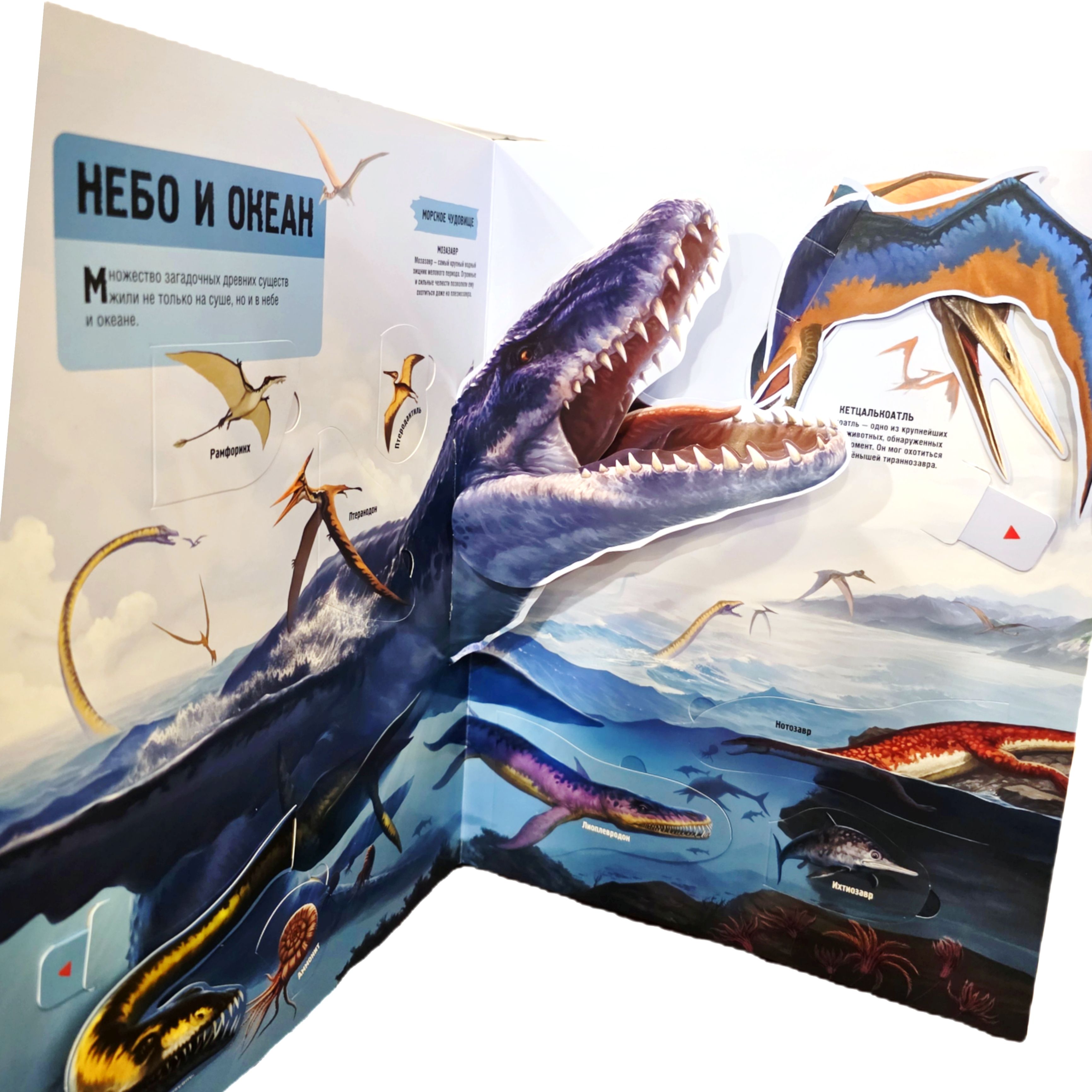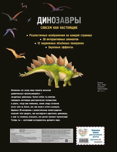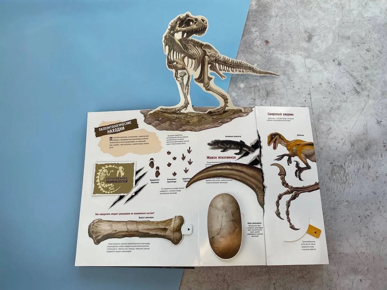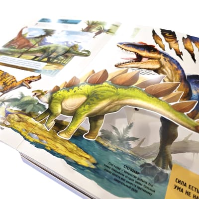Sound effects, large-scale 3D panoramas, moving parts, hinged flaps, super-realistic illustrations and a relief image of a tyrannosaurus on the cover - this book has everything for a complete immersion in the era.