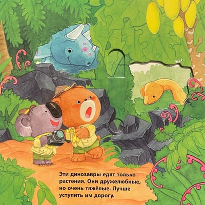 Join Mishka and his friends in a unique park where the most ancient inhabitants of our planet live—dinosaurs. On land, in the water, and in the air—you'll meet them everywhere! Some dinosaurs are friendly, others not so much; some eat grass and hide behind trees, while others need to be fed meat. Don't worry, it's completely safe to observe them! Go ahead!