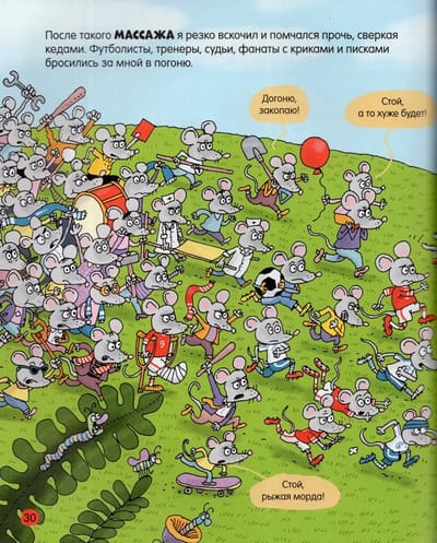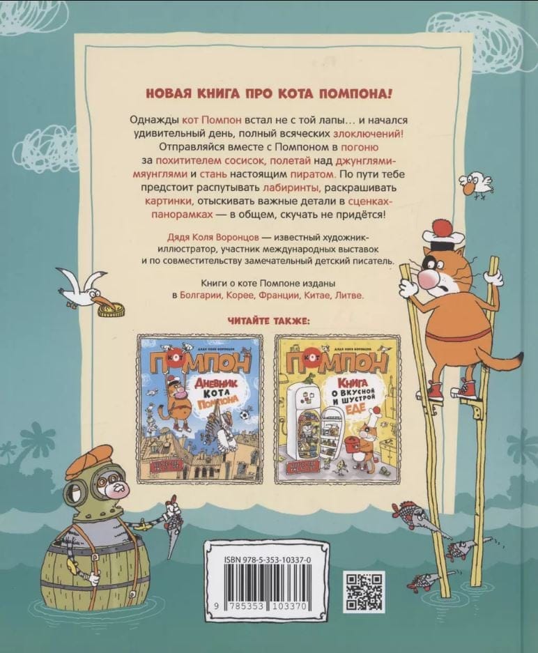Pompon the cat likes to have fun, eat good food and read interesting books while sitting in a soft armchair. And the rest of the time he sleeps soundly. One day Pompon woke up very early, when it was still dark outside the window, got up on the wrong paw and a wonderful day full of all sorts of misadventures began! Thanks to this book, together with Pompon you will go in pursuit of the sausage thief, cross the Plühei Sea in a basin, fly over the jungle-miaungle and maybe even become a real pirate. And along the way you will have to unravel mazes, color pictures, find important details in the scenes-panoramas in general, you will not be bored!