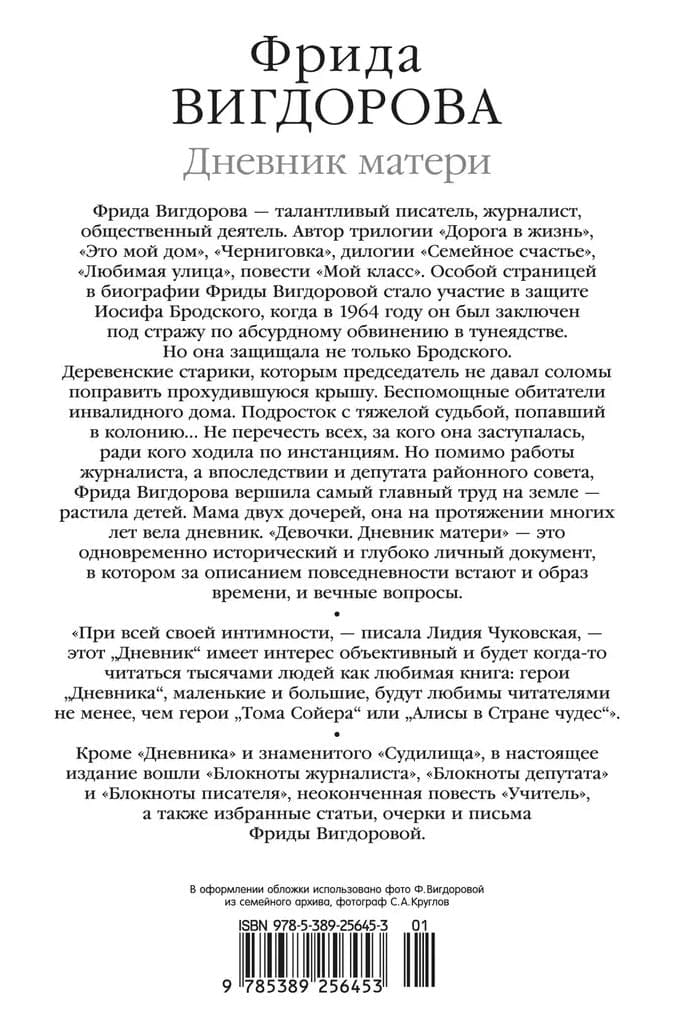 In addition to the “Diary” and the famous “Court”, this edition includes “Notes of a Journalist”, “Deputy Notepads” and “Writer’s Notepads”, the unfinished story “The Teacher”, as well as selected articles, essays and letters by Frida Vigdorova.