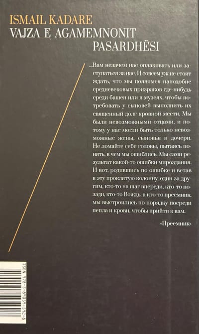 The novel "Agamemnon's Daughter" (1985) is told from the perspective of a young man, the lover of the daughter of a party official appointed as the country's leader's successor. The girl's personal life is sacrificed to her father's political ambitions. During the dictatorship, publication of this text in Albania was impossible; even the manuscript could have landed the author in prison. To save the novel, it was secretly smuggled abroad and stored in a bank vault in Paris. It was only published after political change in the country.