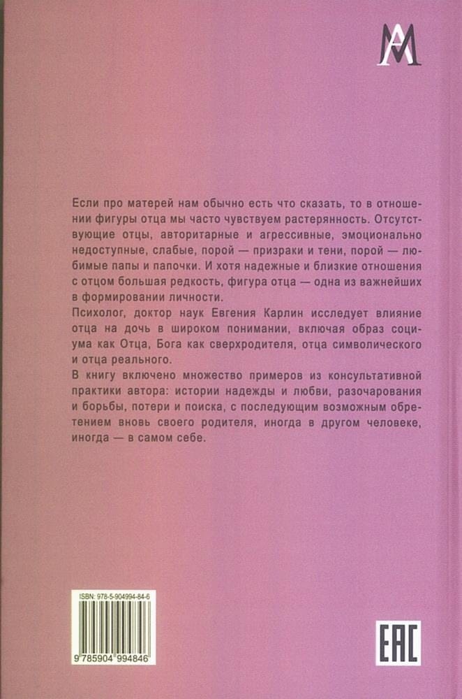 Psychologist, Doctor of Sciences Evgeniya Karlin studies the influence of a father on a daughter in a broad sense, including the image of society as a Father, God as a super-parent, a symbolic father and a real father. The book includes many examples from the author's consulting practice: stories of hope and love, disappointment and struggle, loss and search, followed by the possible rediscovery of one's parent, sometimes in another person, sometimes in oneself. The book is addressed to practicing psychologists and psychotherapists working with problems of parent-child relationships, their clients, as well as everyone interested in the topic of the paternal archetype and relationships with the father.