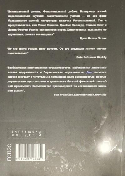 A horror novel about a rapidly expanding house; a story about the power of love; a satire on pseudoscientific speculation; a fundamental study of a film that does not exist, made by a blind old man; notes from the labyrinths of the subconscious; a sentimental wandering through the infernal circles of life - all this in an endless interweaving creates a single plot of "House of Leaves".