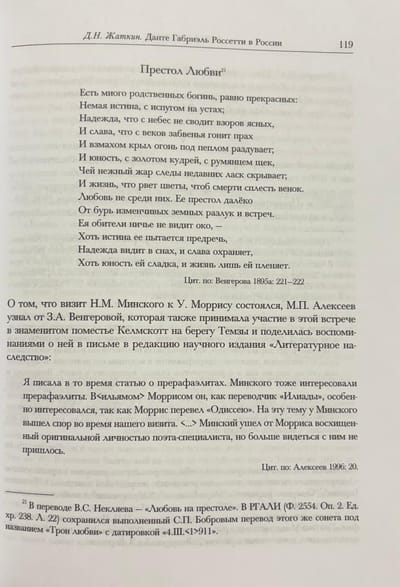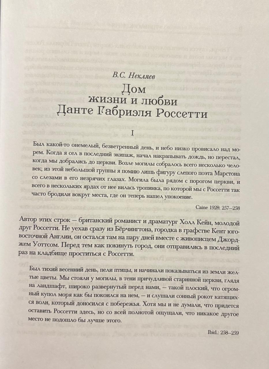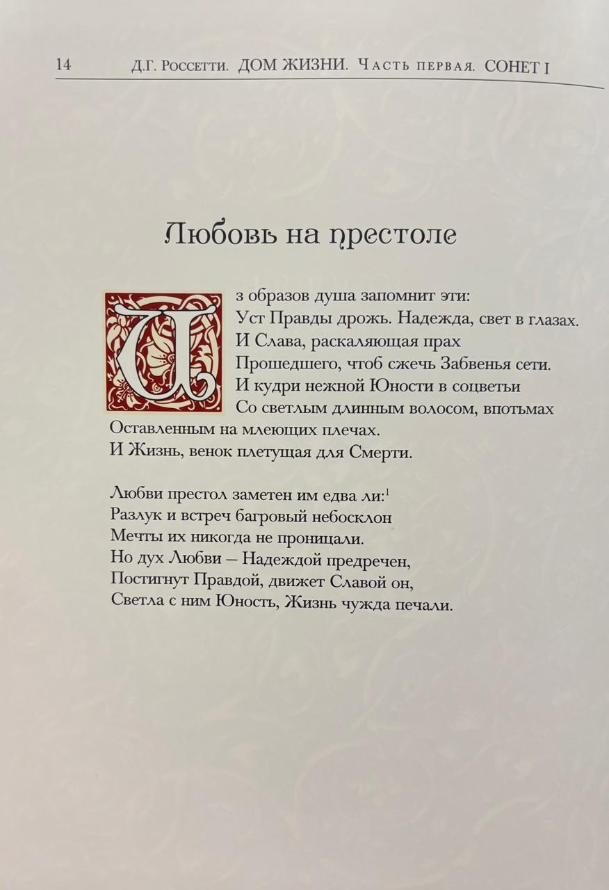 The main literary achievement of D.G. Rossetti was the cycle "House of Life" of 101 sonnets, created throughout almost the entire creative path of the poet. The title of the collection reflects its specific content: the house of life for the poet is creativity, love, philosophy and nature, of which man is a part. In the sonnet form Rossetti saw an opportunity to embody the moment in all its fullness and originality. Each sonnet recreates a certain hour of the poet's life, mood, atmosphere, picture, which he considered worthy of immortalization. One of the main characters in the sonnets is Love, who appears at the intersection of erotic and spiritual - not an idealized "beautiful lady", but a woman of flesh and blood. Rossetti's sonnets are marked by vivid illustrative effects and an atmosphere of luxurious beauty, serving as perfect illustrations for his paintings. Since almost all of the sonnets echo Rossetti's paintings, and many of them are inseparable from their "pictorial counterparts," this pairing was the basis for the design of the present edition. In general, the pictorial series of Rossetti's paintings (more than 150 paintings) presented in the two-volume edition will provide a large-scale view of the creative path of the British genius. The scientifically commented translation of "The House of Life", as well as more than 60 other poems by Rossetti, which make up the "Supplements" section, was prepared by the largest Russian expert on the poet's work and a remarkable translator V.S. Neklyaev (pseudonym Vlanes). The edition is accompanied by detailed articles on the life of Rossetti (V.S. Neklyaev) and on the perception of his poetic heritage in Russia (D.N. Zhatkin). The edition was developed (in terms of design layout) and printed as a highly artistic one. For the production of the first book (a full-fledged pictorial album), special matte coated paper with triple coating (preventing the formation of light glare, which hinders reading) and printing with a very high raster linearity (making the raster grain practically invisible) were used.
