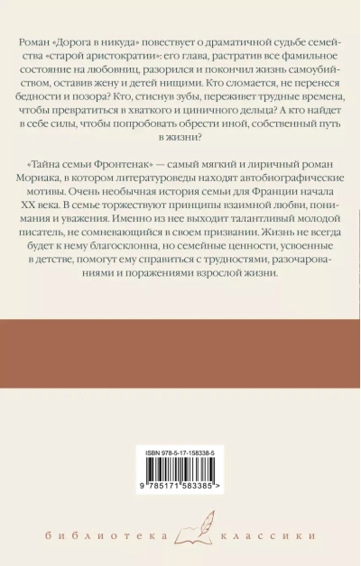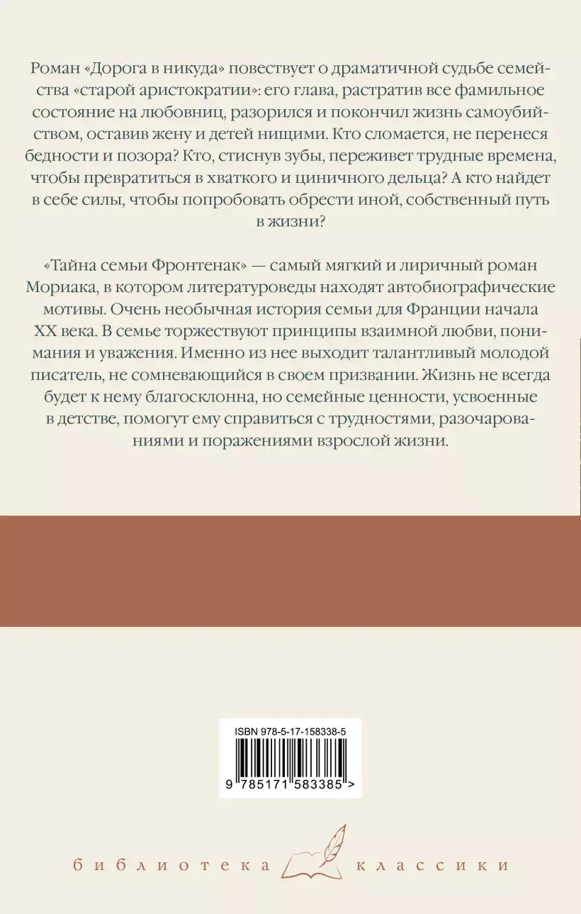 The novel "Road to Nowhere" tells of the dramatic fate of the family "old aristocracy", its head, wasting all the family fortune on mistresses, ruined and committed suicide, leaving his wife and children beggars. Who will break down, not enduring poverty and shame? Who, gritting his teeth, will survive the hard times to turn into a grasping and cynical businessman? And who will find the strength to try to find a different, their own way in life? "The mystery of the family Frontenac" - the softest and lyrical novel Moriac, in which literary scholars find autobiographical motifs. Very unusual family history for France in the early twentieth century. The principles of mutual love, understanding and respect triumph in the family. It is from it that a talented young writer emerges, who has no doubts about his vocation. Life will not always be favorable to him, but the family values learned in childhood will help him cope with the difficulties, disappointments and defeats of adult life.